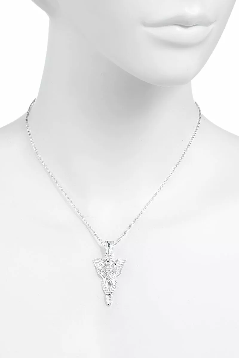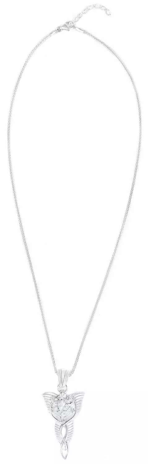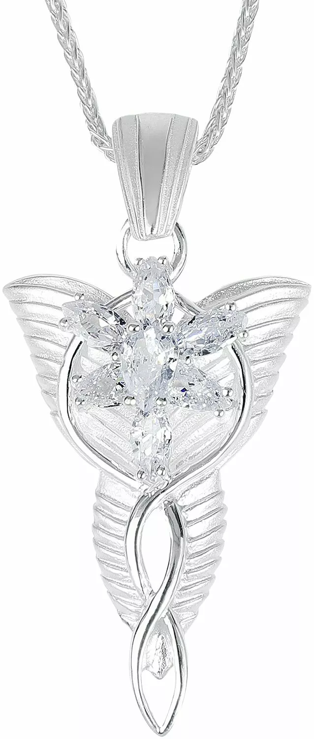 Deze mooie hanger, die zijn naam van de fonkelende avondster gekregen heeft, schonk Arwen aan haar lieve Aragorn, voor wie ze haar eigen onsterfelijkheid opgaf. Hij is ca. 4,4 cm lang en bestaat uit zuivere, gematteerde 925 Sterling zilver met fijne, hoogglans-gepolijste elementen. De ster wordt gevormd door zeven afzonderlijk omrande, mooie, geslepen kristallen, waarin het licht zich rijk weerspiegeld.