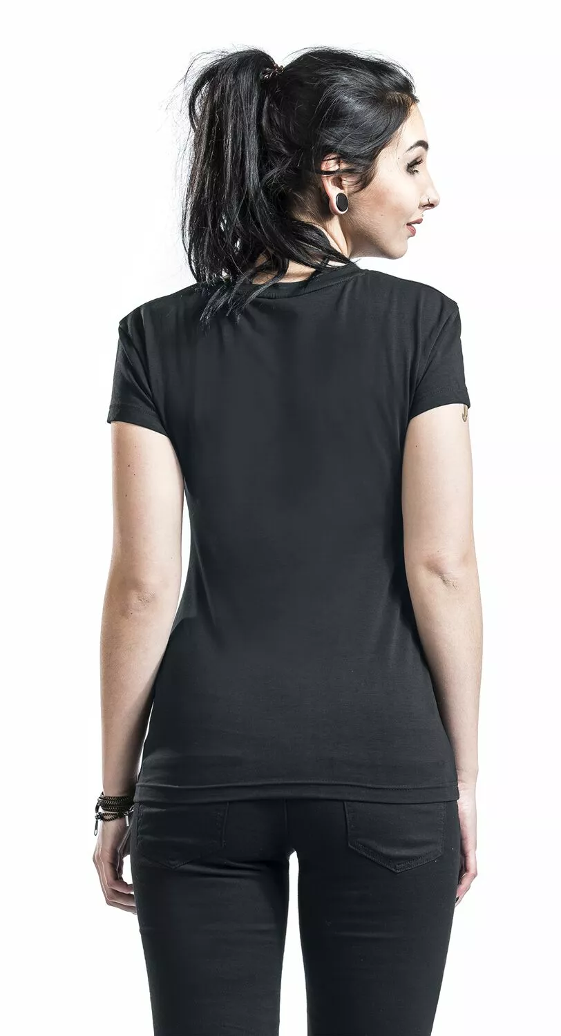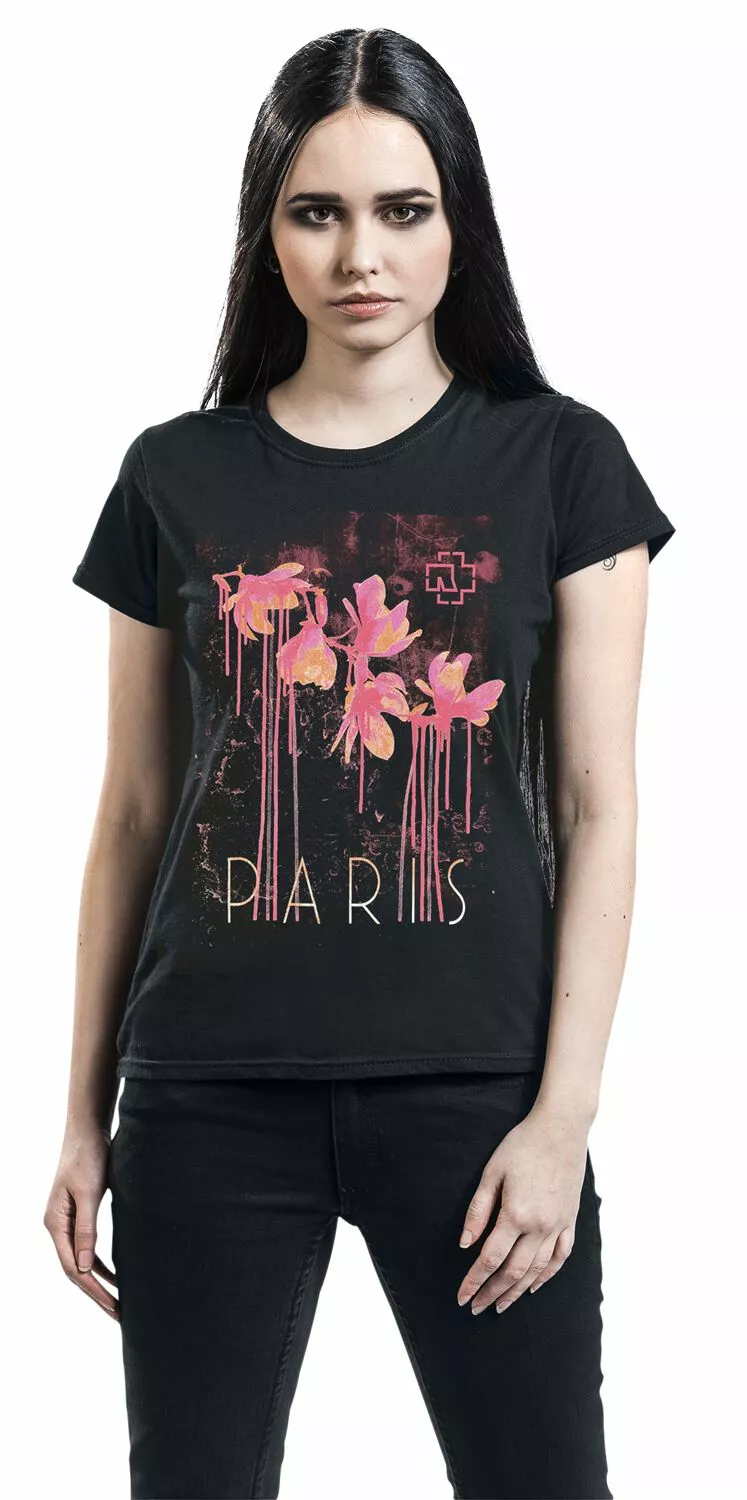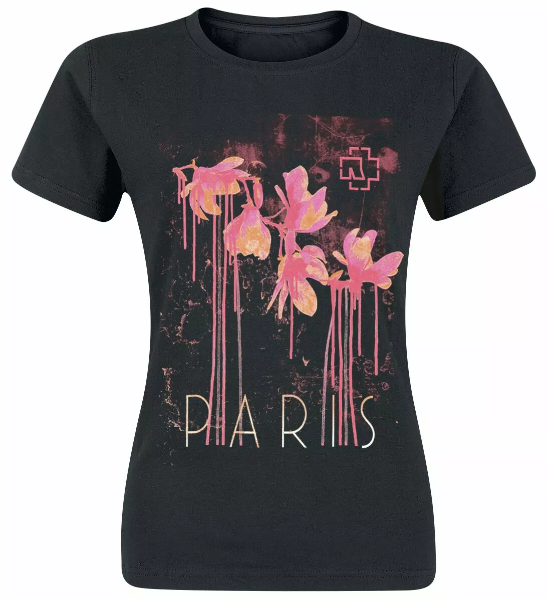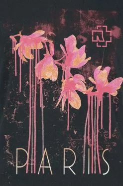 Bij ons is nu dit unieke “Blut Frühling”-girls shirt van de Duitse metalband Rammstein verkrijgbaar! Op de voorkant van het zwarte kledingstuk staat een grote afbeelding van bloedende roze bloemen met “Paris” eronder. Op de linkerborst staat het logo van de band in het rood.