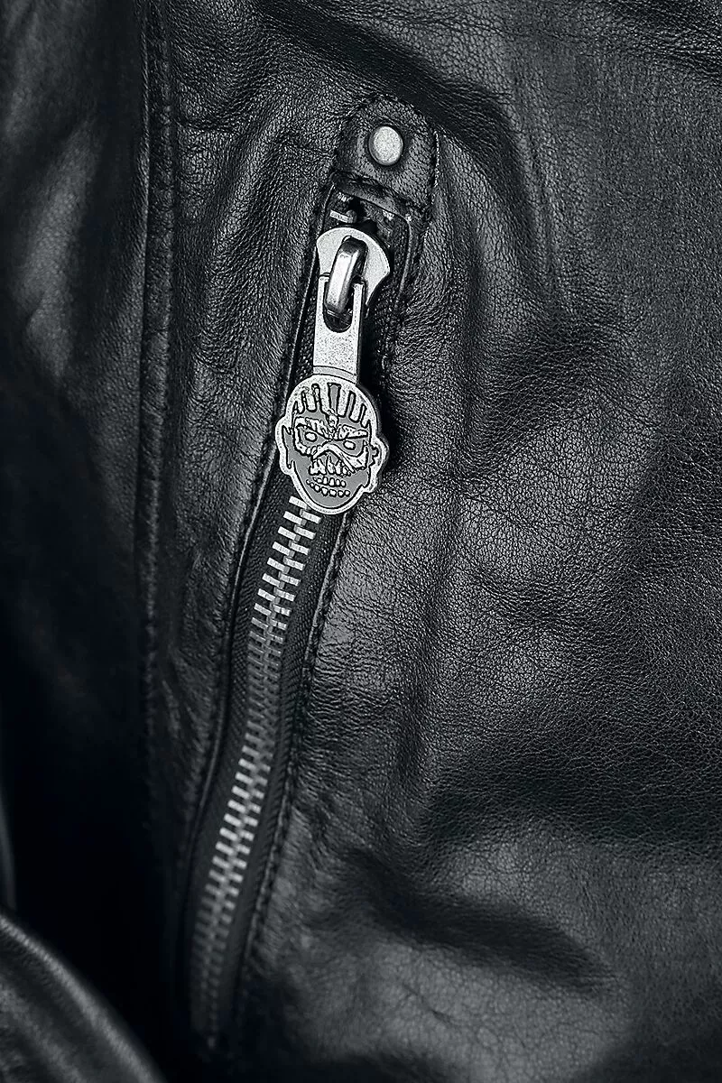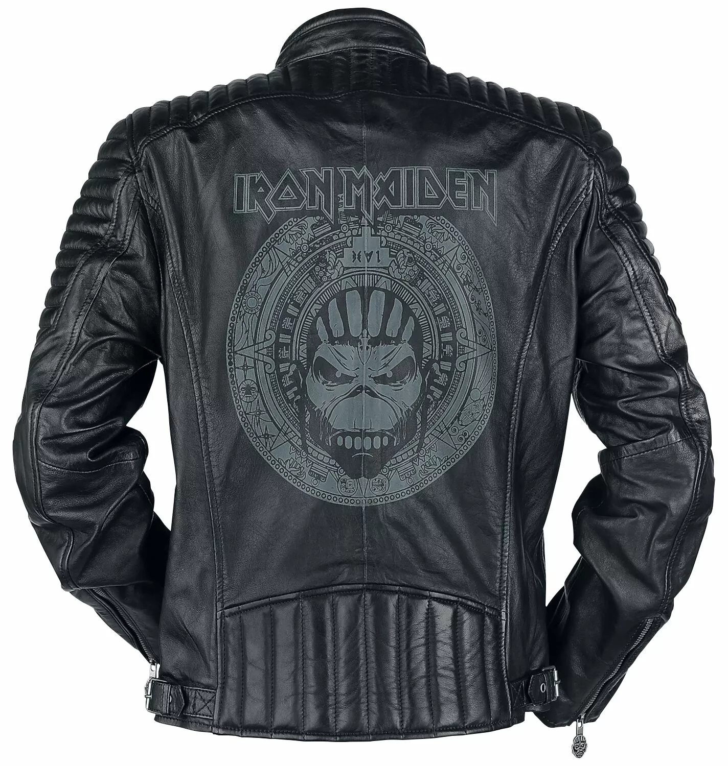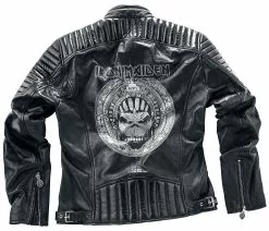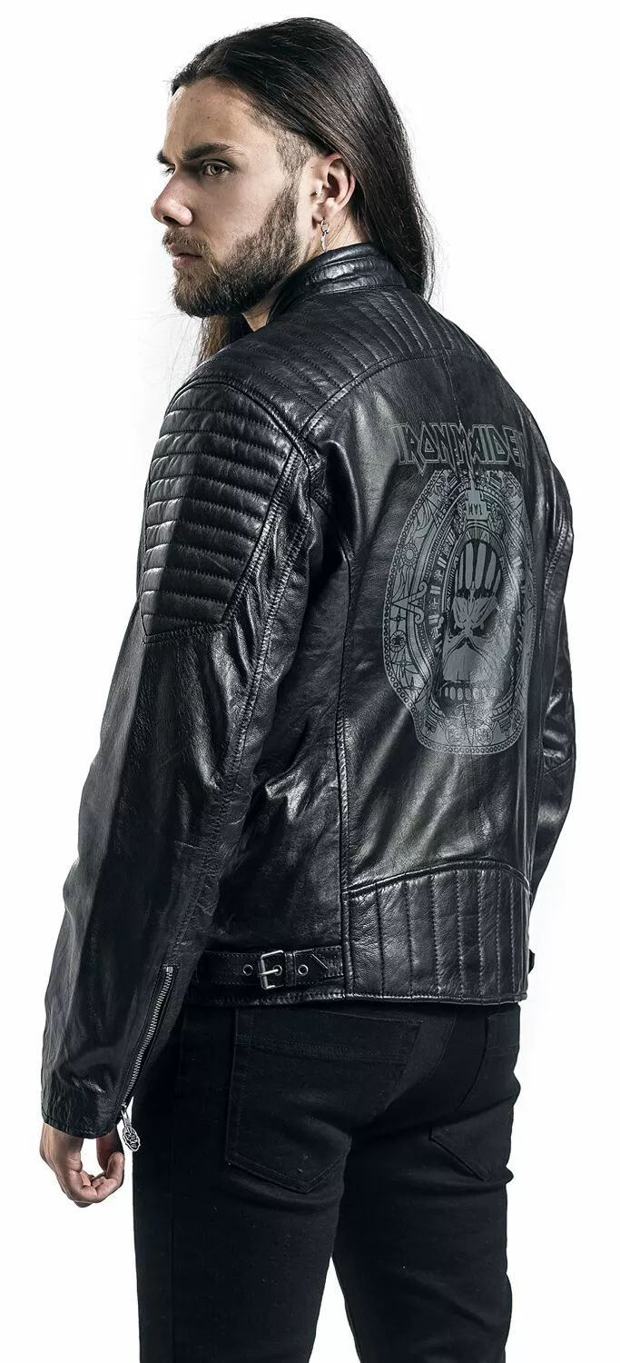 Deze lederen “Book of Souls Skull”-jas van de legendarische heavy metalband Iron Maiden hoort vanzelfsprekend bij het album “The Book of Souls”. Het jack heeft een stoer uiterlijk en een afbeelding van het gezicht van Eddie en van de iconische bandletters van Iron Maiden op de achterkant. Verder is de jas uitgerust met drie binnenzakken en een ritssluiting met een hanger die gevormd is naar het hoofd van Eddie.