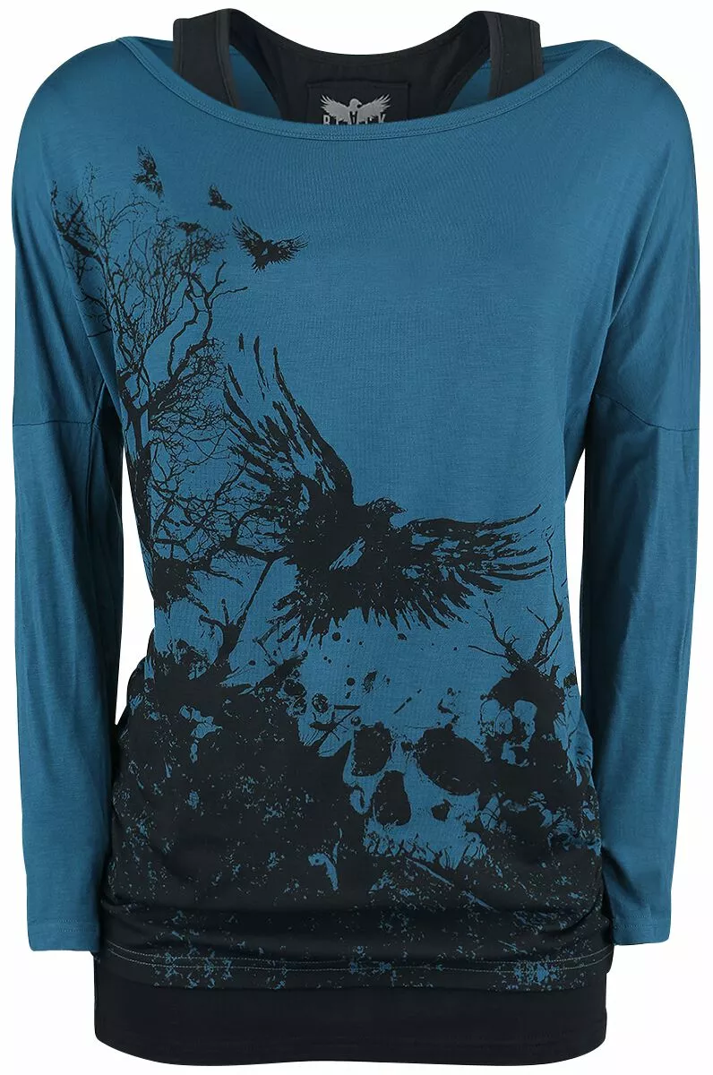 Deze fraaie girls longsleeve van Black Premium by EMP bestaat uit een zwarte top en een shirt met vleermuismouwen en een stijlvolle print van raven en een doodshoofd op de voorkant. De top en het shirt staat uitzonderlijk goed in combinatie met elkaar, maar kunnen ook afzonderlijk worden gedragen.