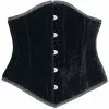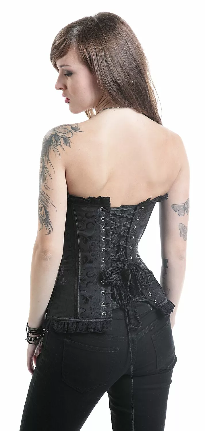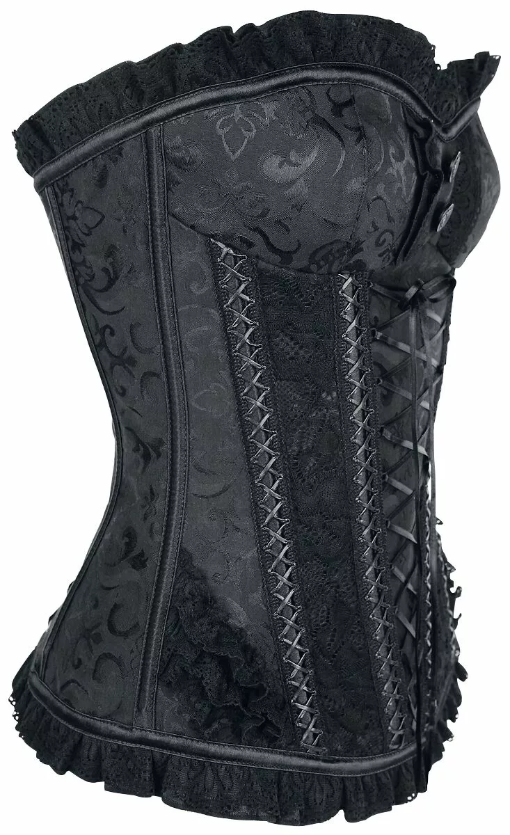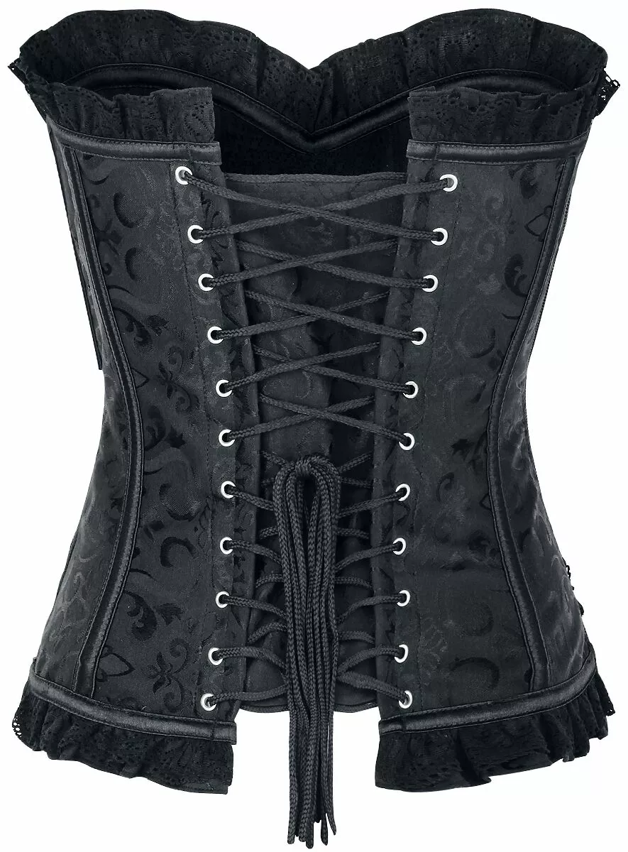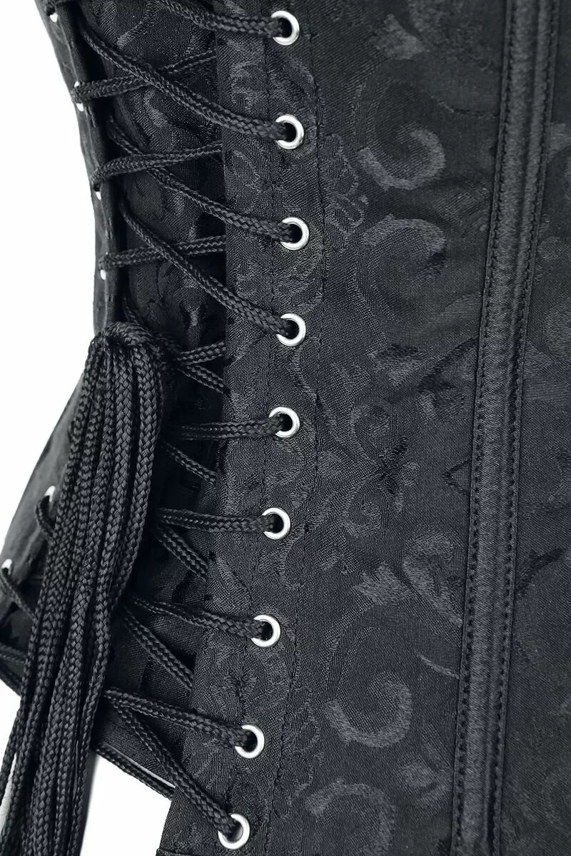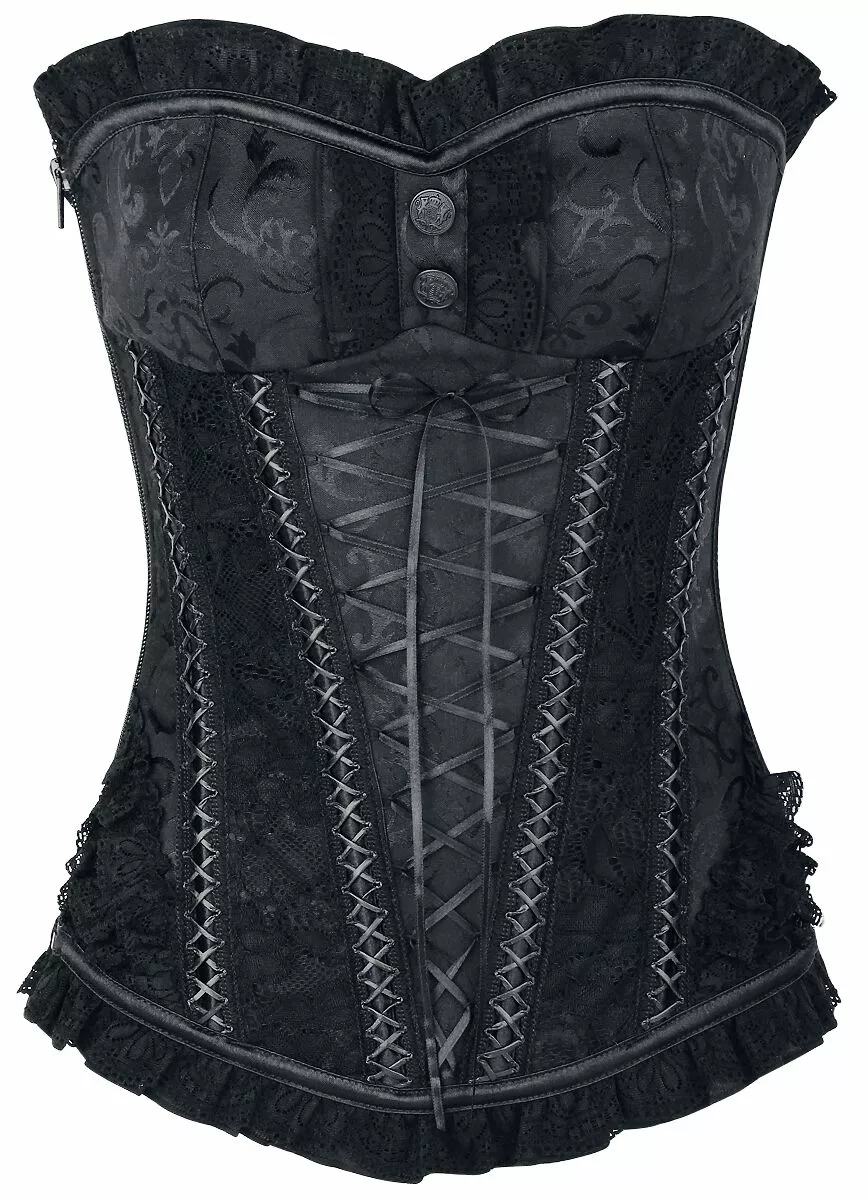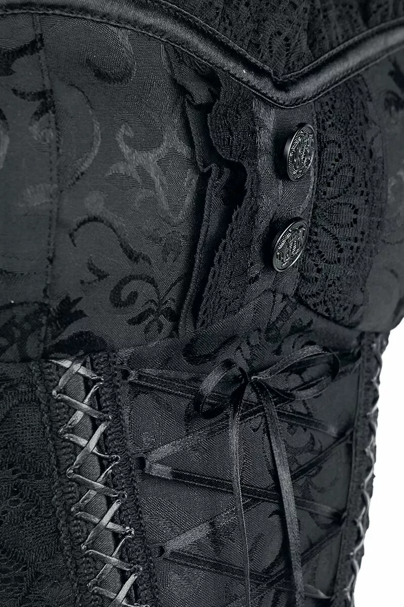Het corset is bedekt met kant. Op de borst vind je 2 decoratieve knopen en op de voorkant decoratieve vetering. Met rits aan de zijkant en het corset kan worden aangesnoerd aan de achterkant.