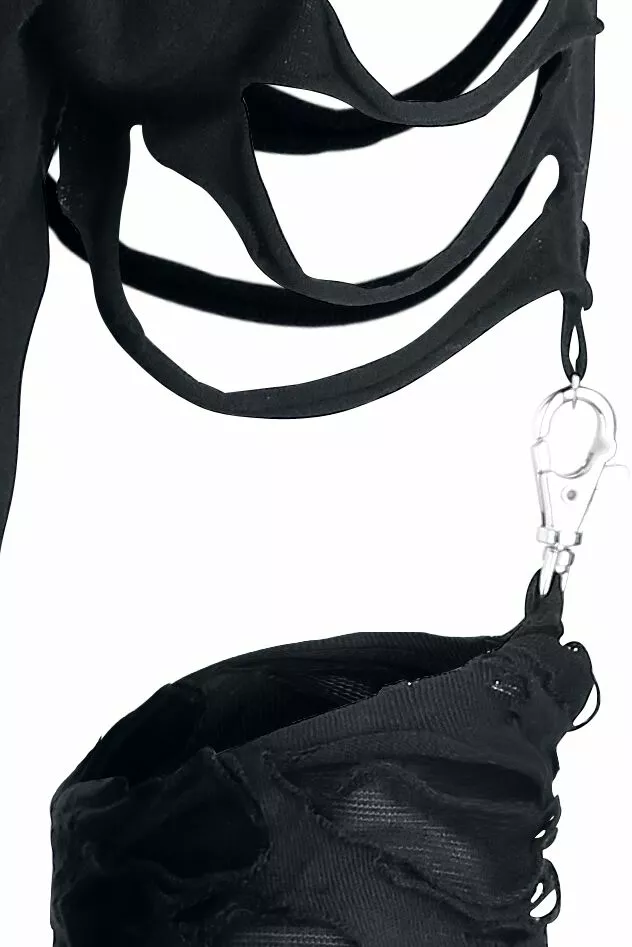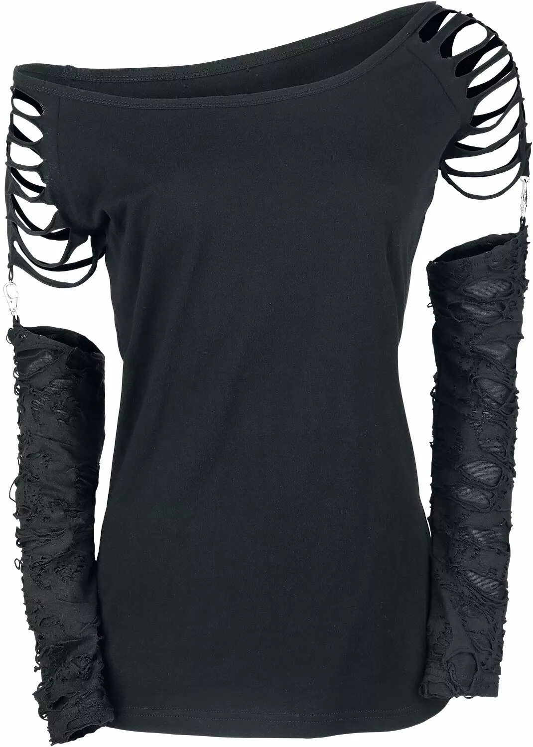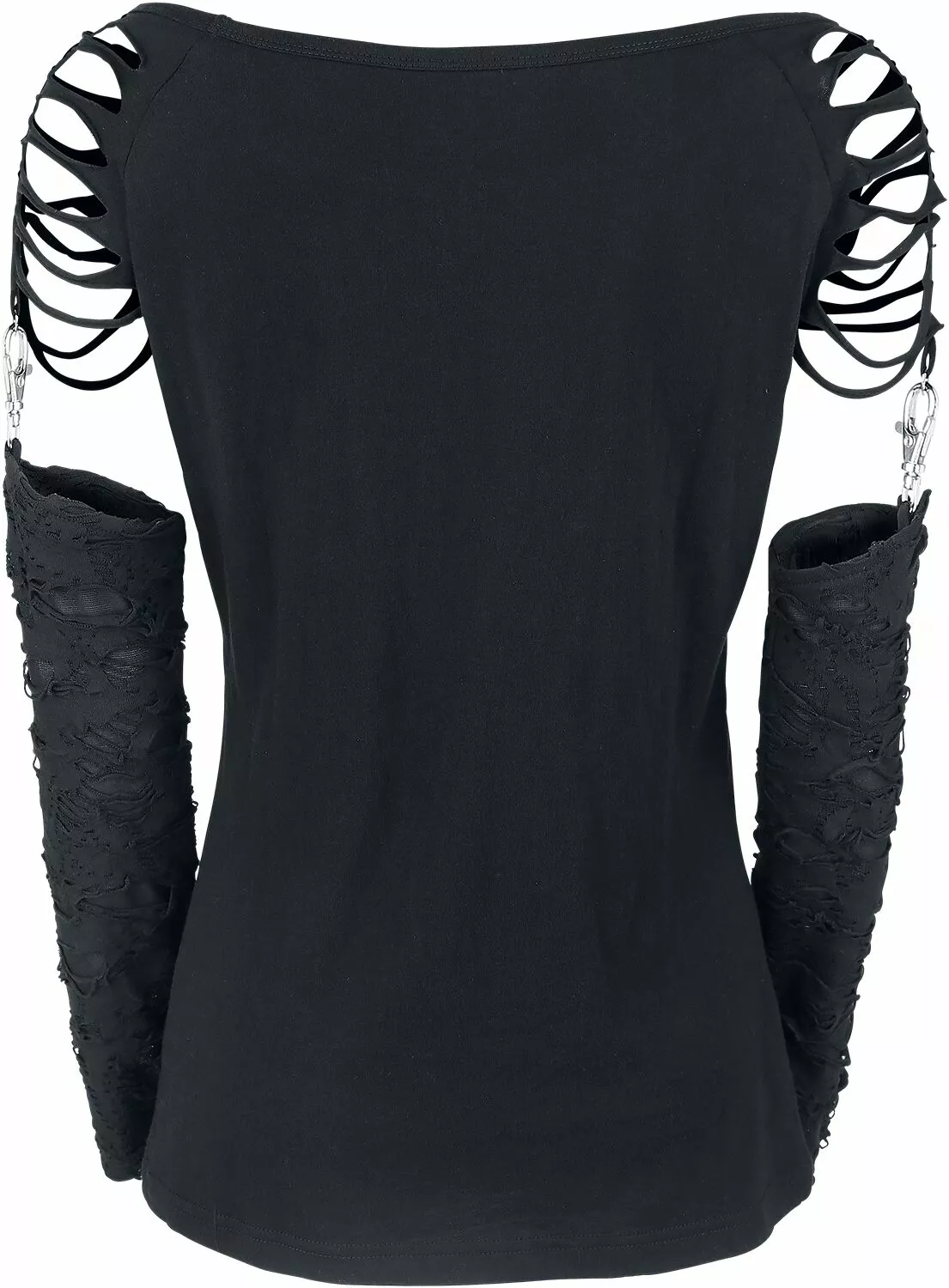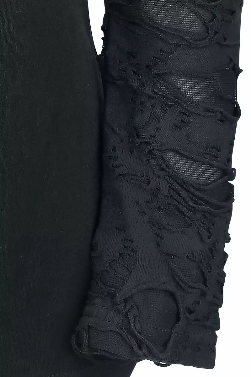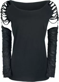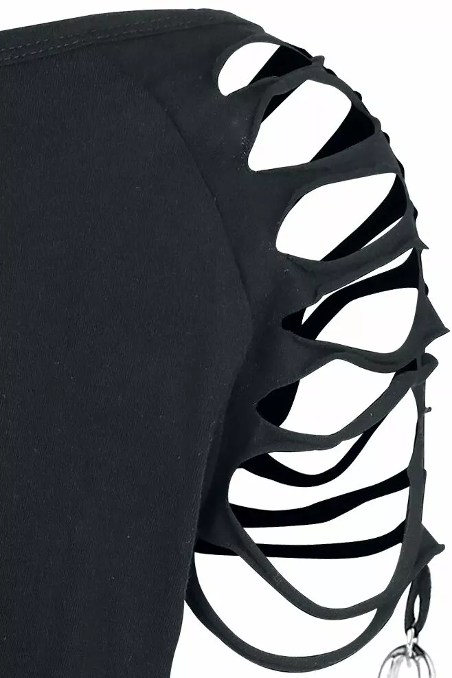 Ben je op zoek naar een longsleeve met iets extra’s? Dan is dit kledingstuk misschien wel wat voor jou! De zwarte “Days Without”-girls longsleeve van Gothicana by EMP heeft afneembare mouwen die aan de schouders zijn bevestigd met zilverkleurige karabijnhaken. De schouders zijn voorzien van fraaie uitsnijdingen. Een kledingstuk dat perfect aansluit op jouw duistere voorkeur!
