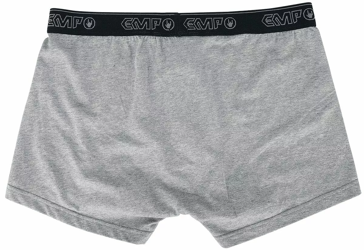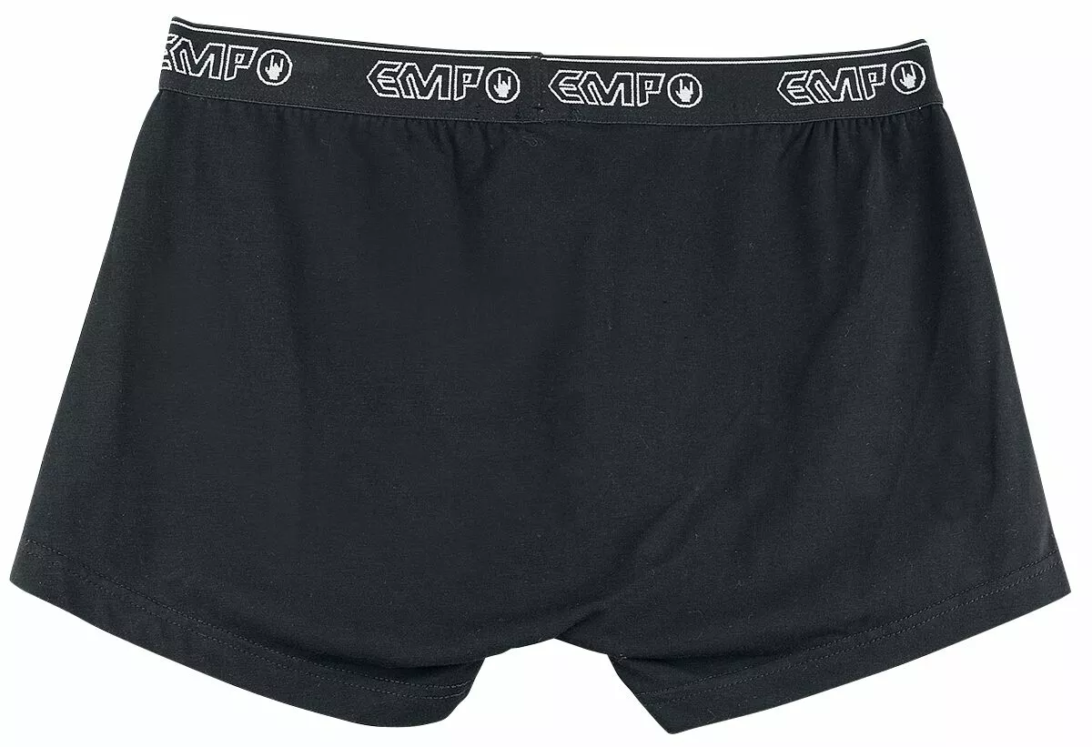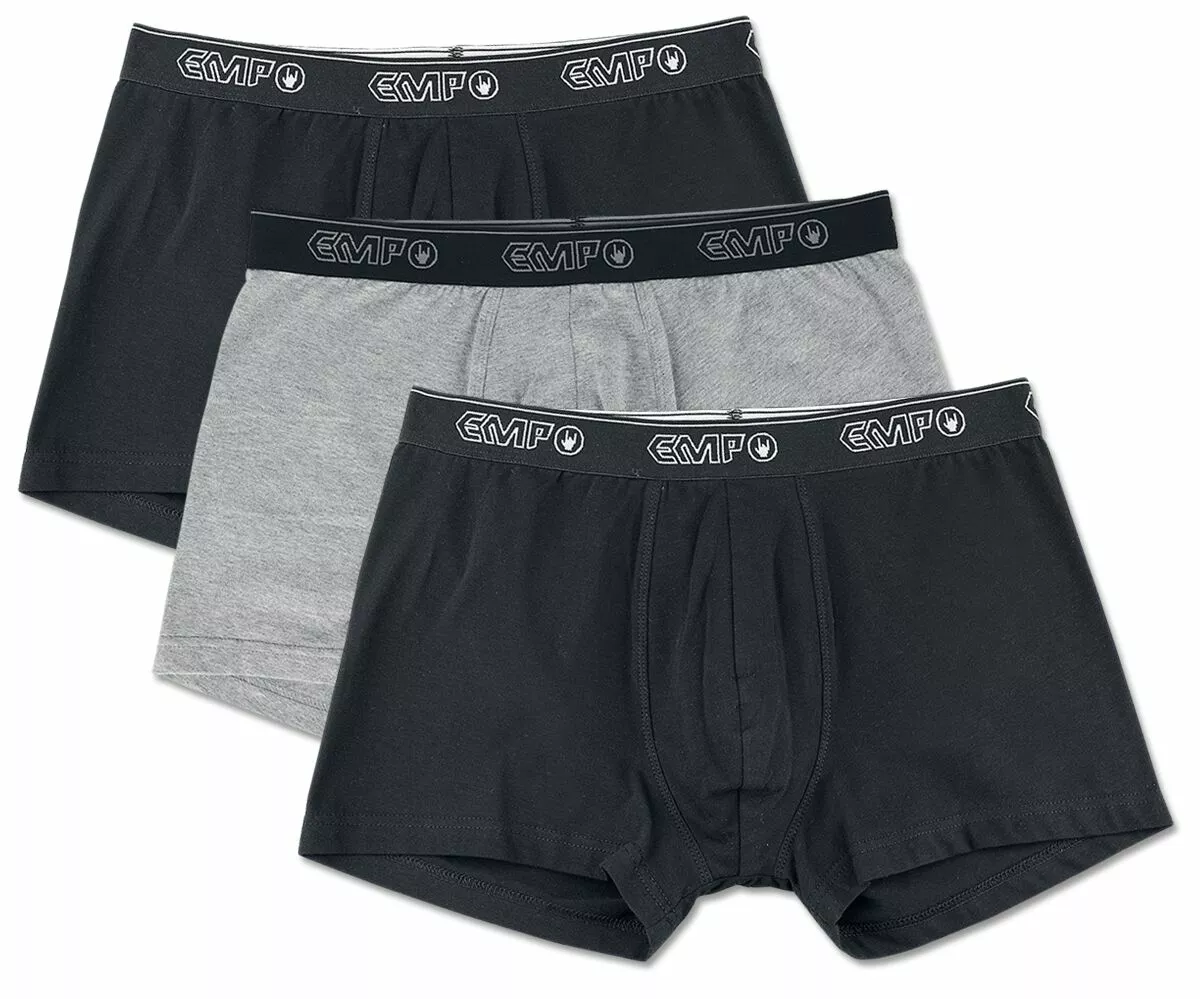 Op zoek naar nieuw ondergoed? Misschien is de set boxershorts “Devil’s Plaything” van RED by EMP dan wel iets voor jou! Deze set bestaat uit drie boxershorts, twee zwarte en een grijze, die allemaal een brede, elastische tailleband hebben waarop het logo van EMP staat. De boxershorts zitten comfortabel en zijn gemaakt van 95% katoen en 5% elastaan.