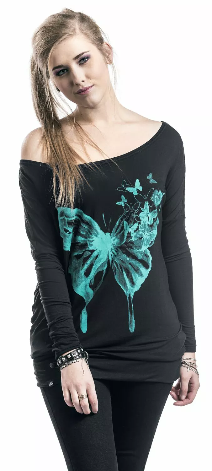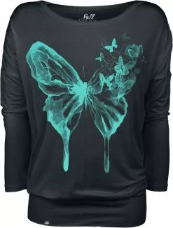 De zwarte girls longsleeve “Fast and Loose” van Full Volume by EMP bezorgt je een zomers gevoel! Het kledingstuk heeft een losse pasvorm en een brede zoom, die mede verantwoordelijk zijn voor het geweldige uiterlijk. De opvallende, kunstzinnige print van vlinders op de voorkant maakt de zomerse stijl van de longsleeve helemaal compleet.