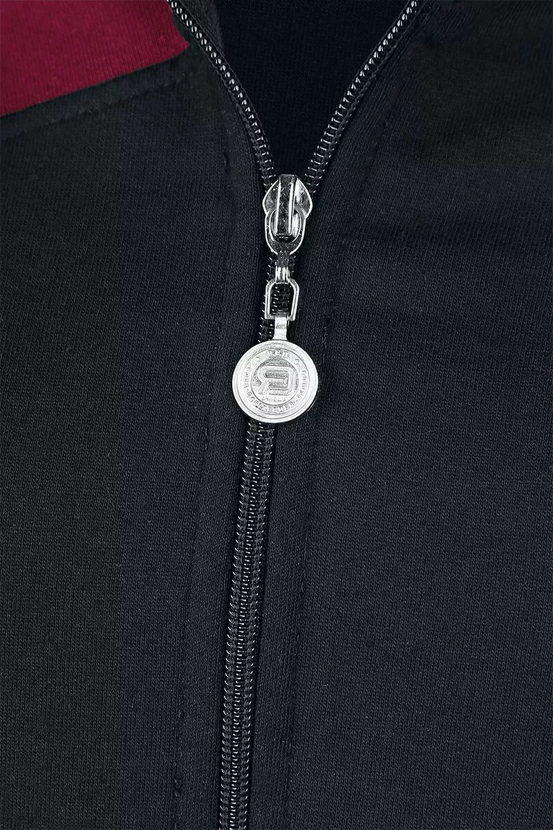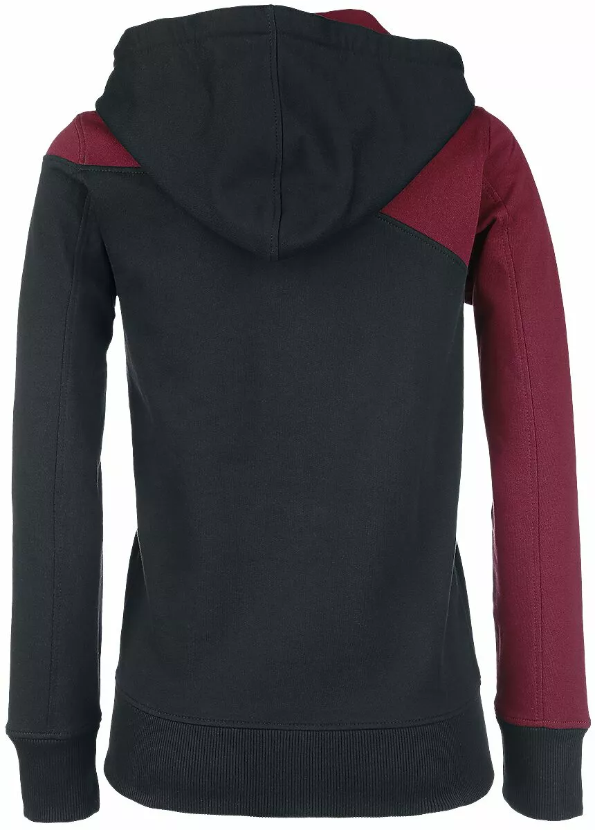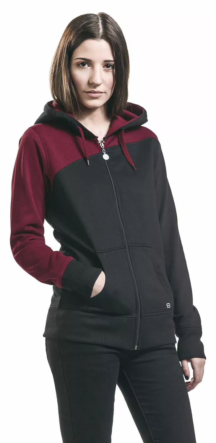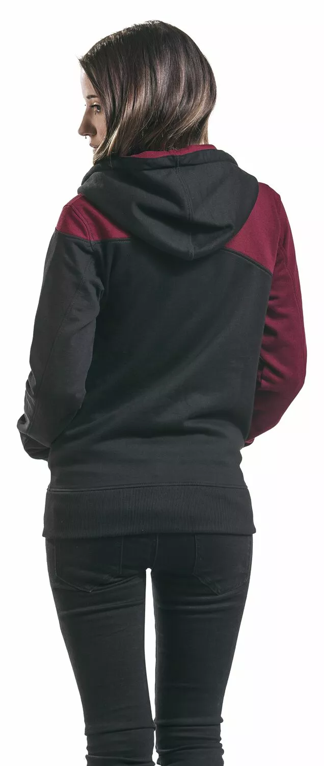Als je effen zwart gewoon te saai vindt, dan is het “Freaking Out Loud”-girls vest met capuchon vast iets voor jou! Dit vest van RED by EMP heeft een asymmetrisch gekleurde, bordeauxrode bovenkant, wat het kledingstuk een strak uiterlijk geeft. Verder heeft de trui een ritssluiting met een gespleten kangoeroezak aan de voorkant, een trekkoord in de capuchon en zomen van ribstof.