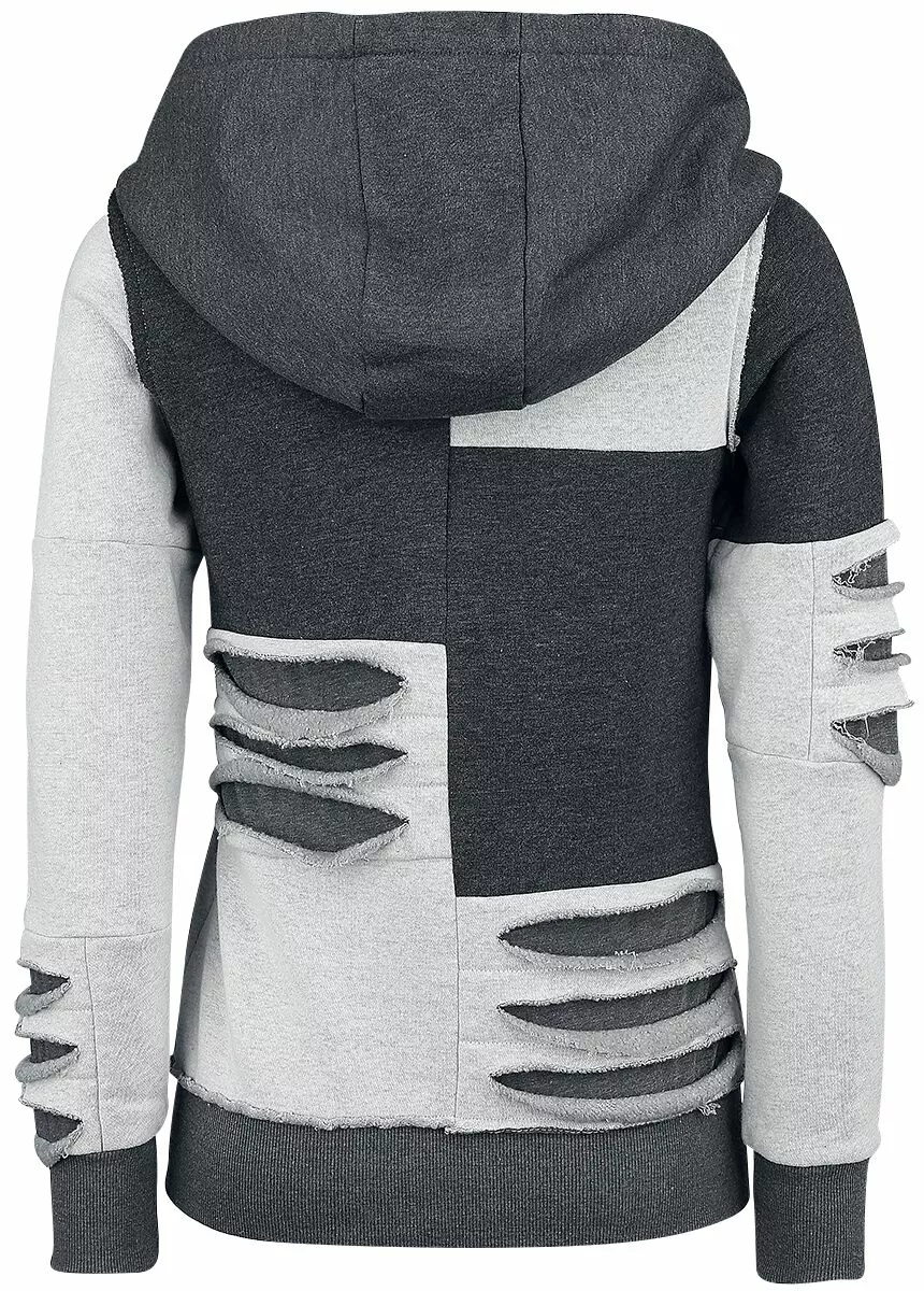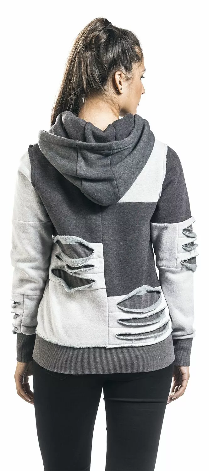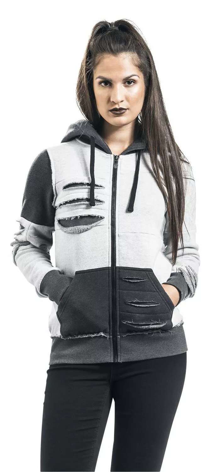 Black Premium by EMP presenteert met trots dit bijzonder fraaie “Mask of Sanity”-girls vest met capuchon voor tussen de seizoenen door! Het kledingstuk is voorzien van enkele stijlvolle uitsnijdingen. Het beschadigde uiterlijk, het trekkoord in de capuchon en gespleten kangoeroezak maken het geheel helemaal compleet.