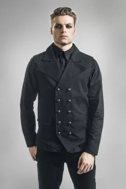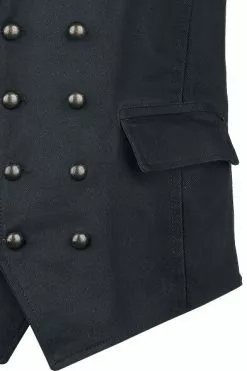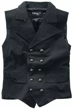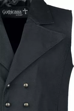 Gothicana by EMP staat voor stijlvolle kleding met een gothic- en steampunkstijl. De klassieke pasvorm van deze elegante bodywarmer doet direct denken aan Victoriaanse tijden. Het kledingstuk past perfect bij een fraaie gothic outfit en is prima geschikt voor cosplayfeestjes en andere excentrieke gelegenheden. De mouwloze bodywarmer is voorzien van metalen knopen, een opstaande kraag, een dubbele knopenrij en een verstelbare gesp aan de achterkant.