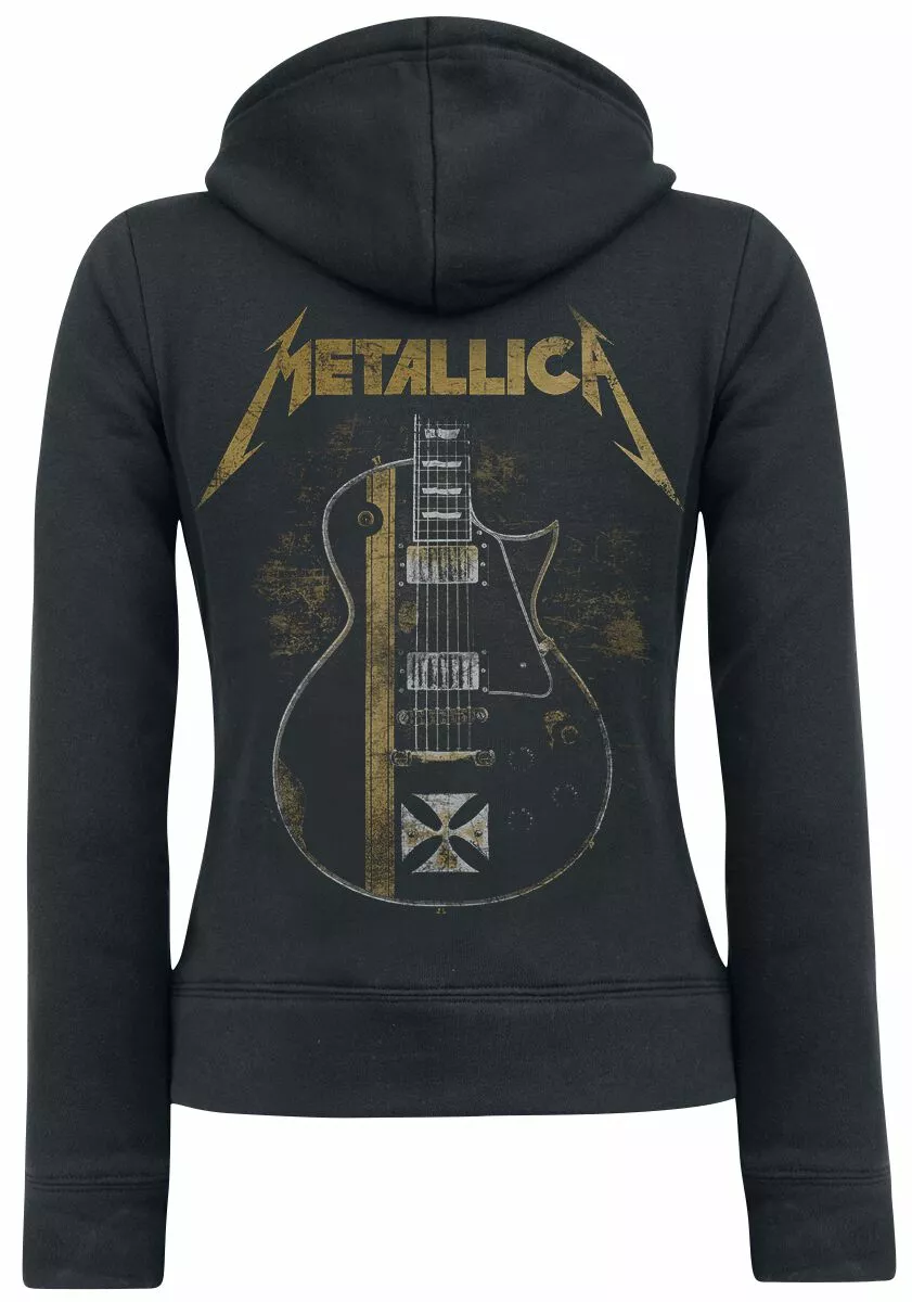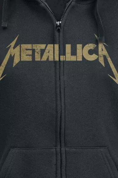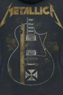 Op de achterkant van het vest “Hetfield Iron Cross Guitar” van Metallica staat een indrukwekkende print van de welbekende gitaar van de leadzanger en gitarist van deze beroemde thrashmetalband. Bovenaan staan de iconische bandletters van Metallica, die je trouwens ook terugvindt op de borst. Het kledingstuk heeft verder een capuchon met een trekkoord, een gespleten kangoeroezak, een bedekte ritssluiting en geribde zomen.