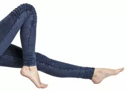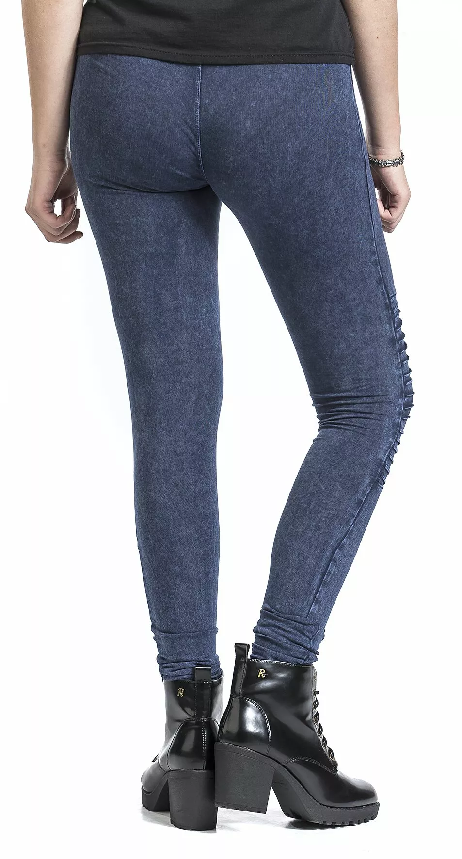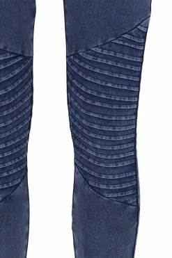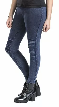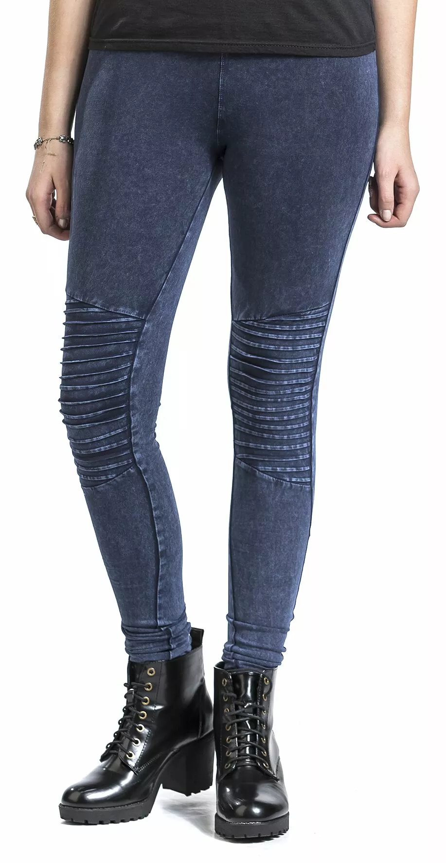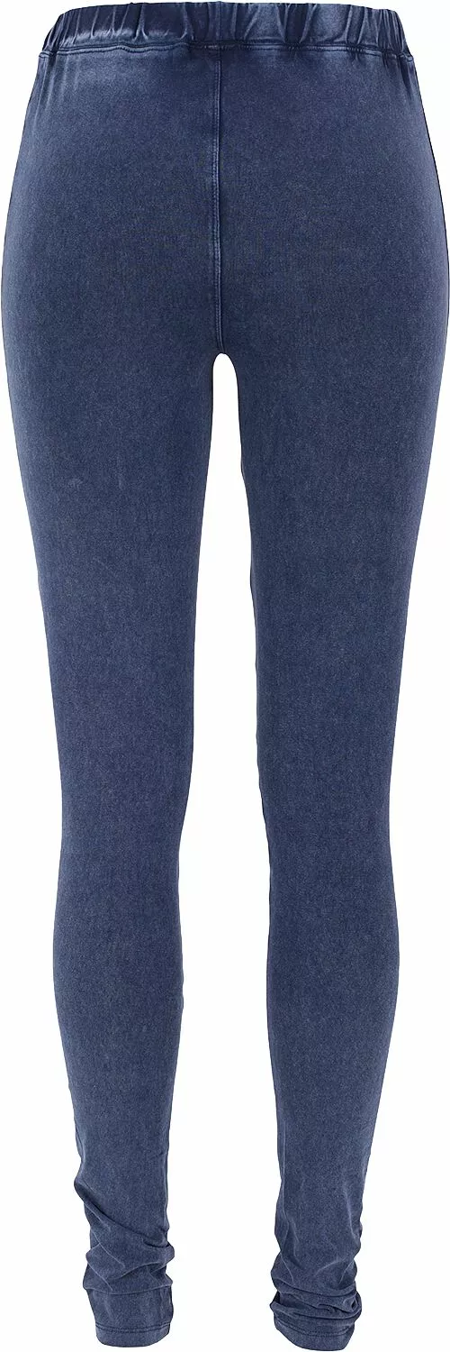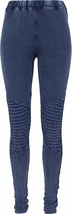 Attentie, bikergirls! Fraaie legging van Urban Classics: de blauwe “Ladies Denim Jersey Leggings” ziet er stoer uit en trekt de aandacht dankzij de geribbelde knieën in bikerstijl en het gewassen uiterlijk.
