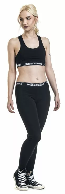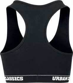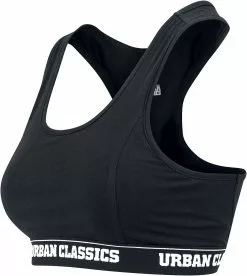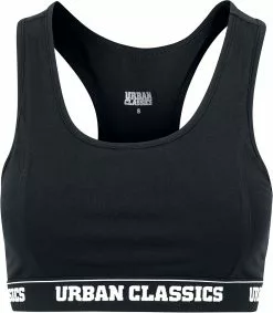 Een Bustier is een strakke top voor dames. Een kenmerkend onderdeel van een bustier is dat het kledingstuk beschikt over een geïntegreerde beha. Een bustier ondersteund de borsten en geeft ze vorm. Deze “Ladies Logo Bra” van Urban Classics is daar een perfect voorbeeld van. Op de elastische onderzoom staat de merknaam van Urban Classics.