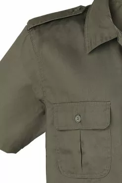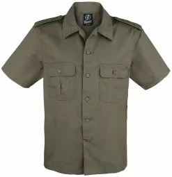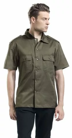 Het Amerikaanse overhemd van Brandit heeft een subtiel militaristisch uiterlijk. Dit olijfkleurige kledingstuk is voorzien van een overhemdkraag, twee borstzakken met een knoopsluiting en twee epauletten. Het overhemd wordt gesloten met een knopenrij aan de voorkant.