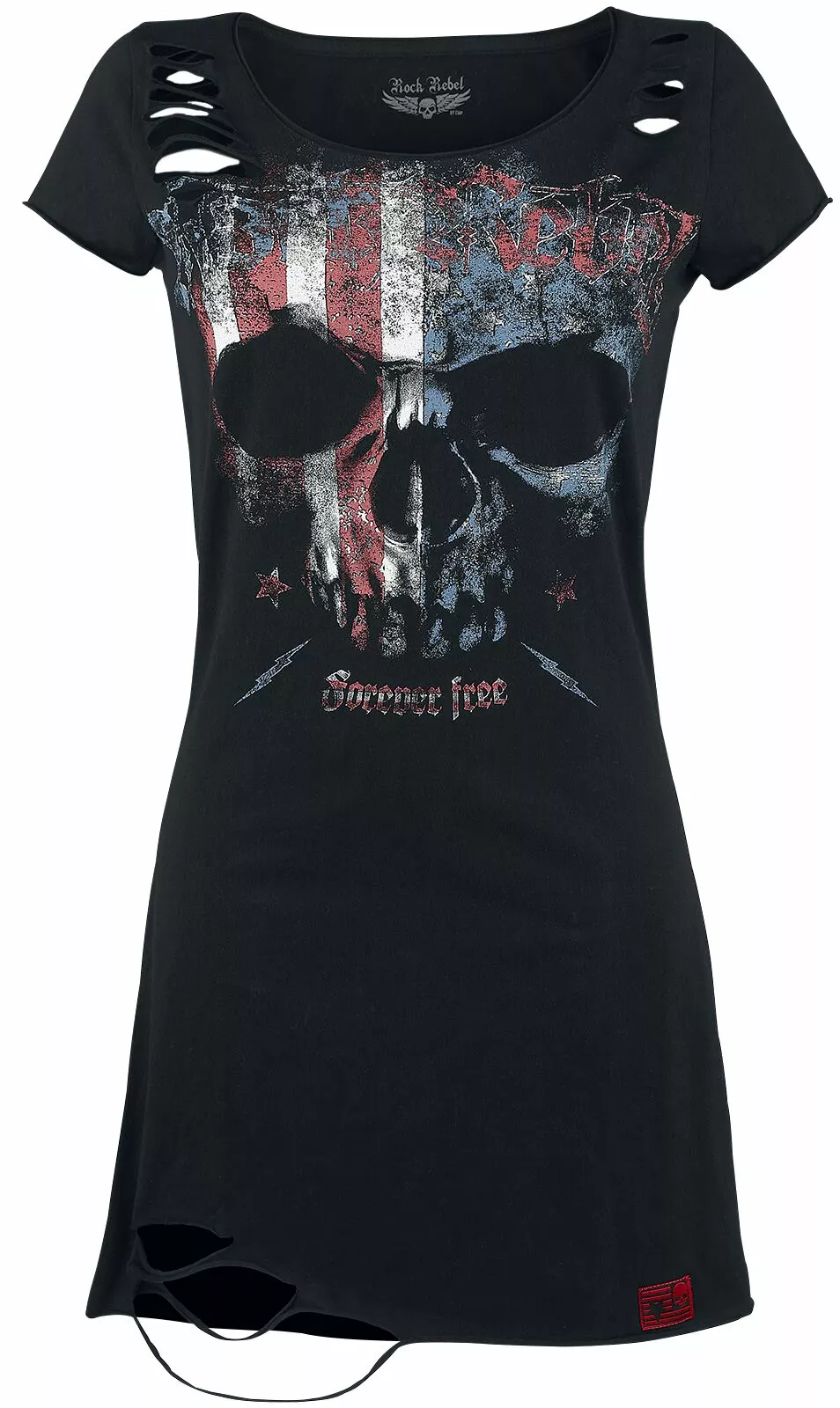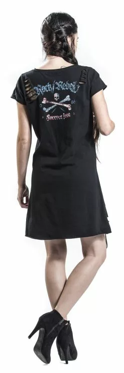 Deze Living Legend jurk is voorzien van een grote doodskop en de tekst ‘Forever Free’. De schouders en de zoom zijn ingesneden. Op de rug van deze aansluitende jurk vind je een schedelprint en het Rock Rebel logo.