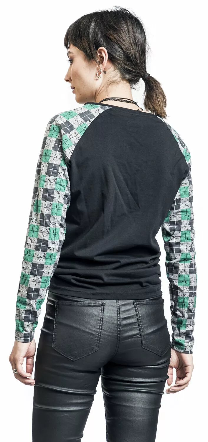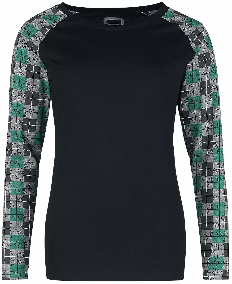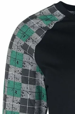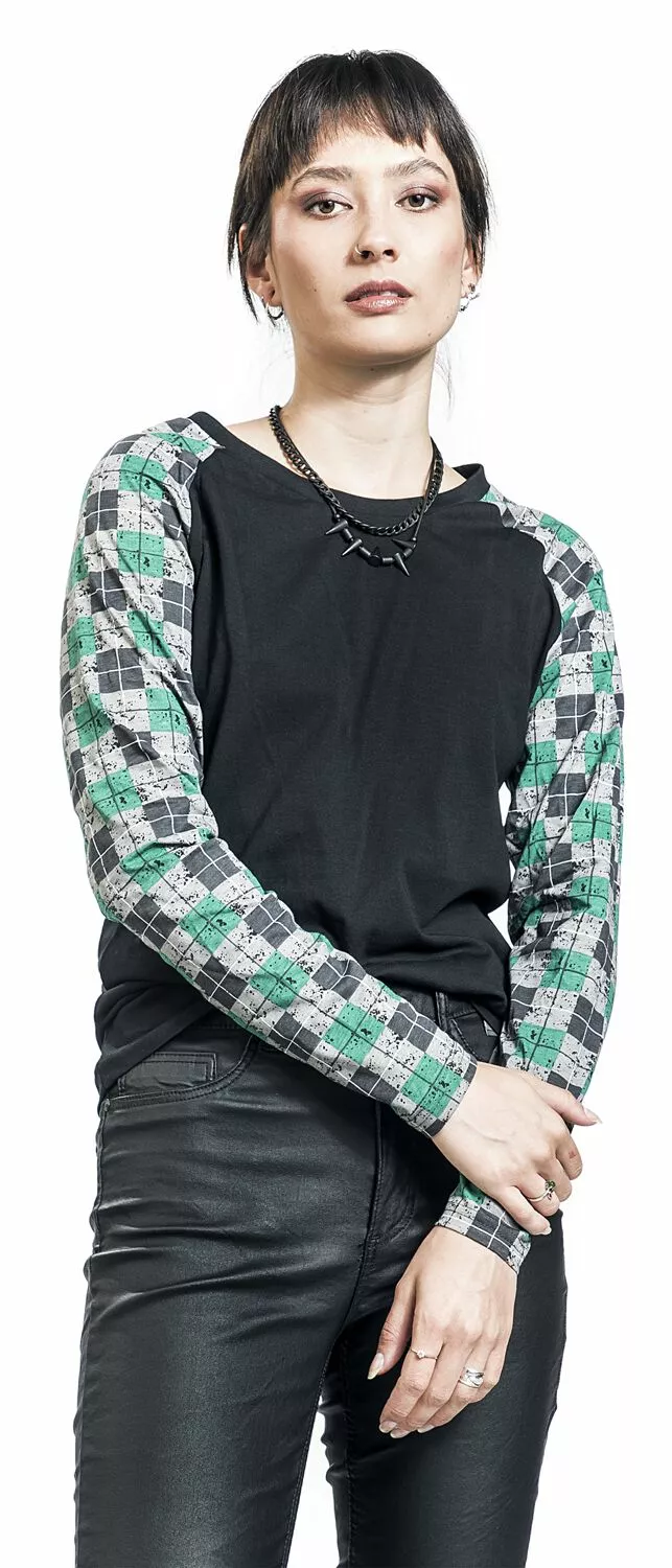 – long raglan sleeves in contrasting colour with all-over print in check design