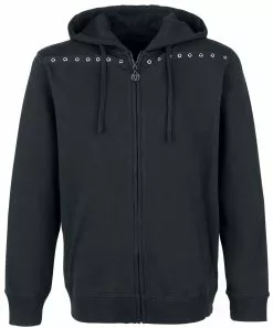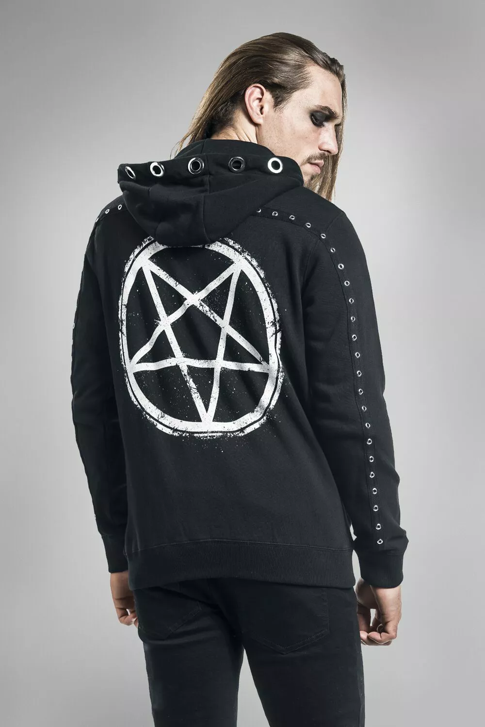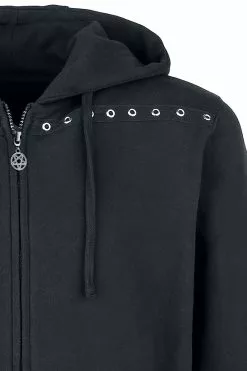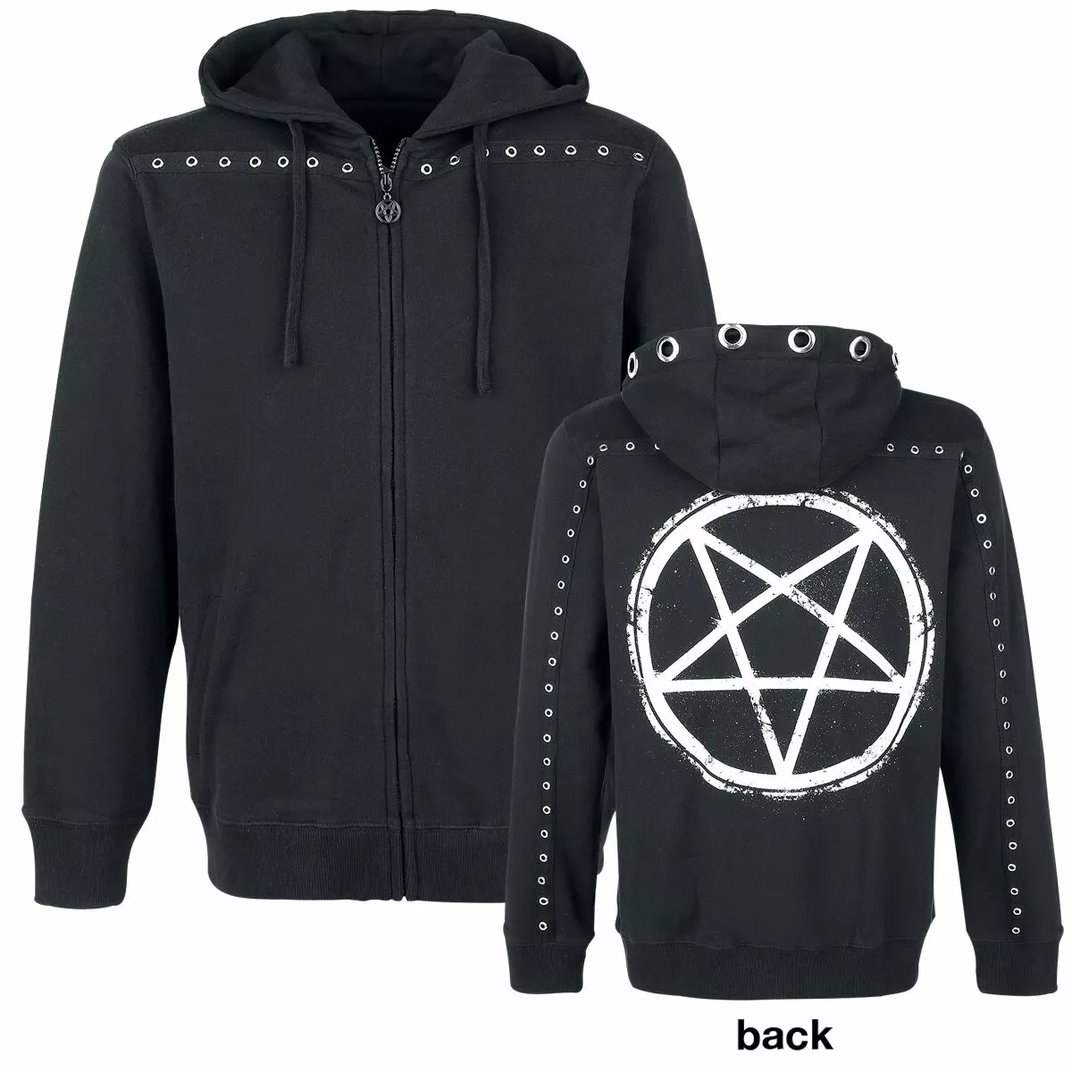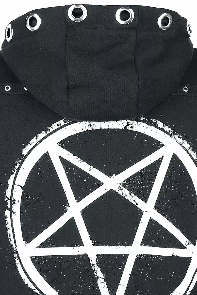 Voel jij je ’s nachts comfortabeler dan overdag? Dan is dit “Mask of Sanity”-vest met capuchon van Gothicana by EMP vast iets voor jou! Het kledingstuk is voorzien van een grote print van een pentagram op de achterkant en eyelets in de capuchon, schouders en mouwen. Verder heeft het vest zomen van ribstof, een steekzak aan beide zijkanten en een trekkoord in de capuchon.