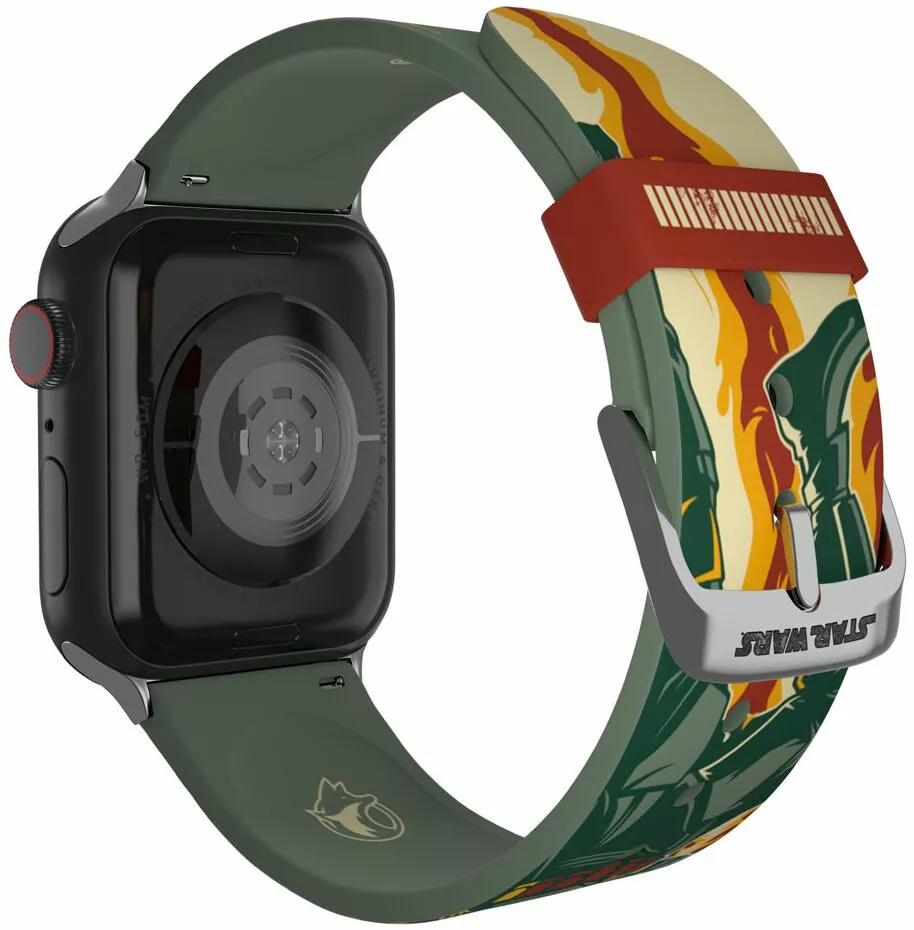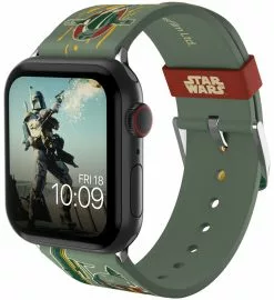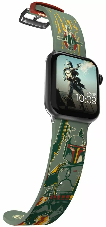 – With his silent demeanor, deadly weaponry and customized Mandalorian armor, Boba Fett is one of the best, most feared bounty hunters in the galaxy. Show your appreciation for the legend with this watch band, which features Boba Fett with his EE-3 carbine blaster rifle, the Slave 1 ship and Mandalorian text on the free loop