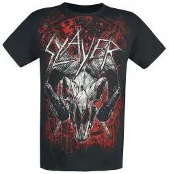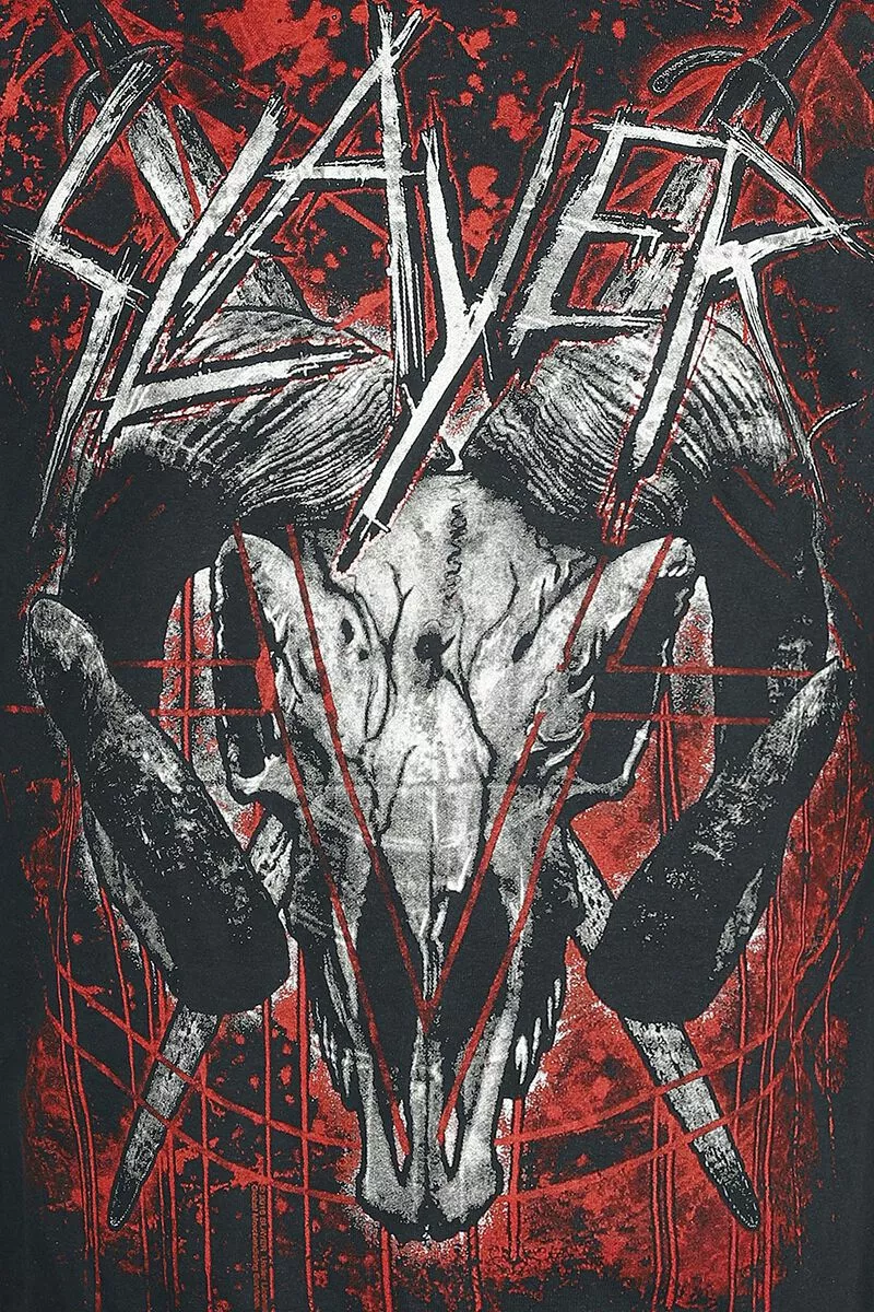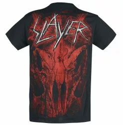 Dit coole Slayer t-shirt zou in de garderobe van elke fan moeten zijn. In het midden van de gigantische frontprint, zie je een satanistische geitenschedel met gekruiste zwaarden en bloedspetters op de achtergrond, met daarboven het grote Slayer logo. Het geitenschedelmotief is ook op de achterzijde compleet in rood geprint. Dit t-shirt is exclusief bij large.