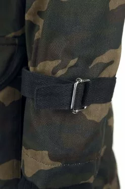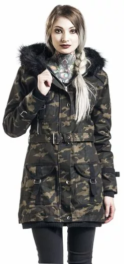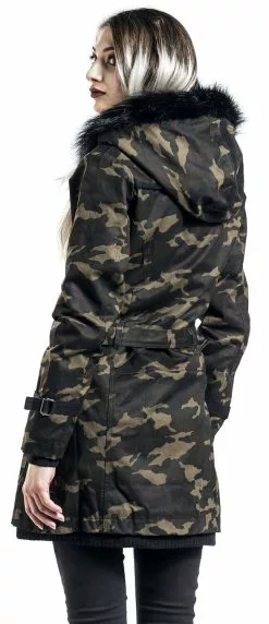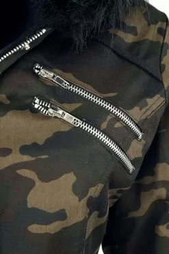 Ben je toevallig op zoek naar winterjas met een fraai camouflagepatroon voor de koudere dagen van het jaar? Dan ben je bij ons aan het juiste adres! Deze girls doeltreffende “Multi Pocket Jacket” van Gothicana by EMP heeft een capuchon met een zachte voering van fleece en een kraag gemaakt van kunstvacht. De jas zelf is ook voorzien van een zachte voering van fleece. Verder heeft het kledingstuk een verstelbare tailleriem, een blinde ritssluiting met een drukknopenrij, verschillende zakken met een gesp of een ritssluiting, een decoratief bandje met een schuifgesp aan beide mouwen en geribde zomen.