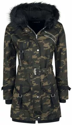 Ben je toevallig op zoek naar winterjas met een fraai camouflagepatroon voor de koudere dagen van het jaar? Dan ben je bij ons aan het juiste adres! Deze girls doeltreffende “Multi Pocket Jacket” van Gothicana by EMP heeft een capuchon met een zachte voering van fleece en een kraag gemaakt van kunstvacht. De jas zelf is ook voorzien van een zachte voering van fleece. Verder heeft het kledingstuk een verstelbare tailleriem, een blinde ritssluiting met een drukknopenrij, verschillende zakken met een gesp of een ritssluiting, een decoratief bandje met een schuifgesp aan beide mouwen en geribde zomen.