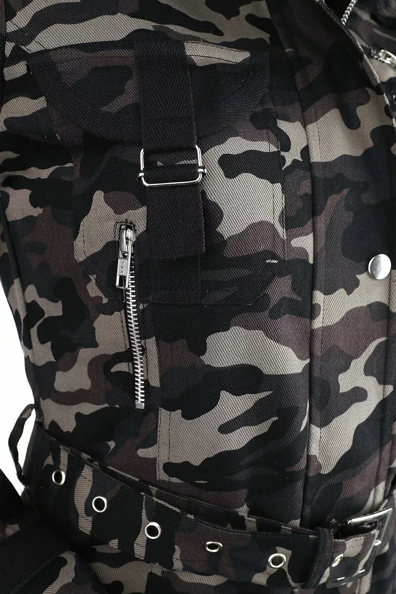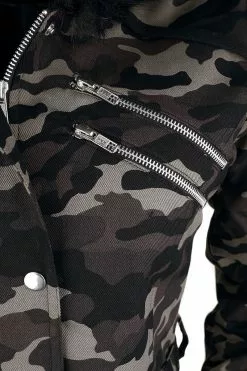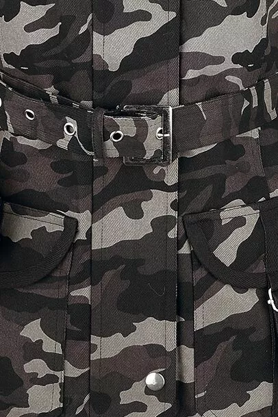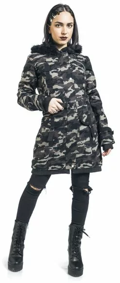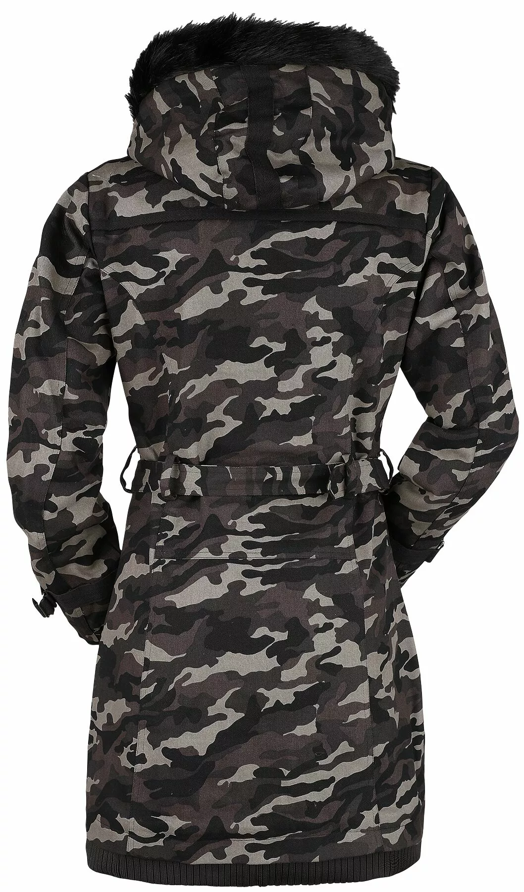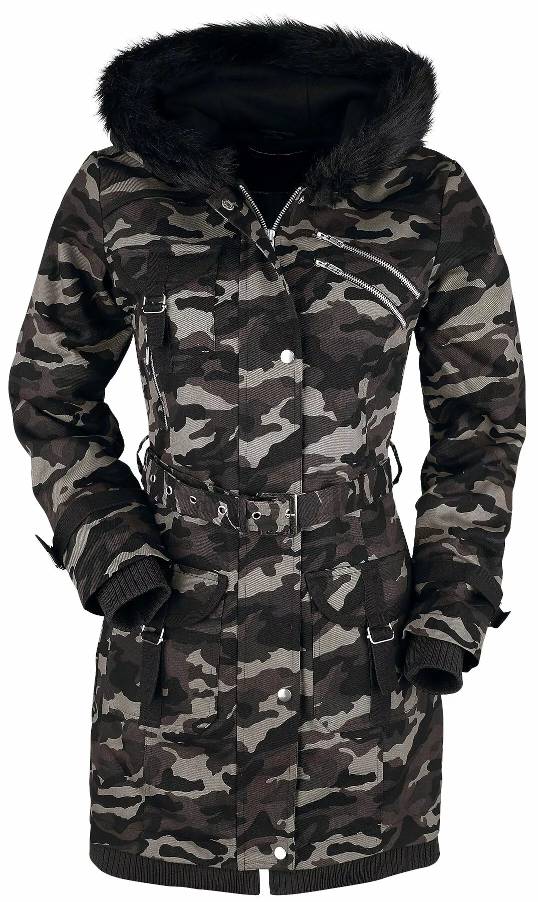 Als je op zoek bent naar een winterjas met een cool camouflagepatroon, ben je bij ons aan het juiste adres! Deze girls “Multi Pocket Jacket” van Gothicana by EMP heeft een capuchon met een zachte voering van fleece en een kraag gemaakt van kunstvacht. De jas zelf is ook voorzien van een zachte voering van fleece. Verder heeft het kledingstuk een verstelbare tailleriem, een blinde ritssluiting met een drukknopenrij, verschillende zakken met een gesp of een ritssluiting, een decoratief bandje met een schuifgesp aan beide mouwen en geribde zomen.