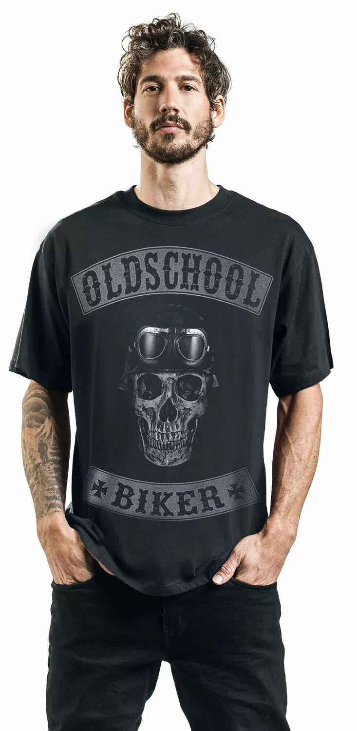 Als je van een oldschool biker-look houdt, dan is dit T-shirt iets voor jou! Het shirt “Oldschool Biker Skull” heeft namelijk een coole print op de voorkant van een schedel met een helm op en een klassieke motorbril. Bovenaan lees je het woord “Oldschool” en onderaan staat het woord “Biker”. Het kledingstuk zit lekker comfortabel dankzij de normale pasvorm en de ronde halslijn. Exclusief verkrijgbaar bij Large!