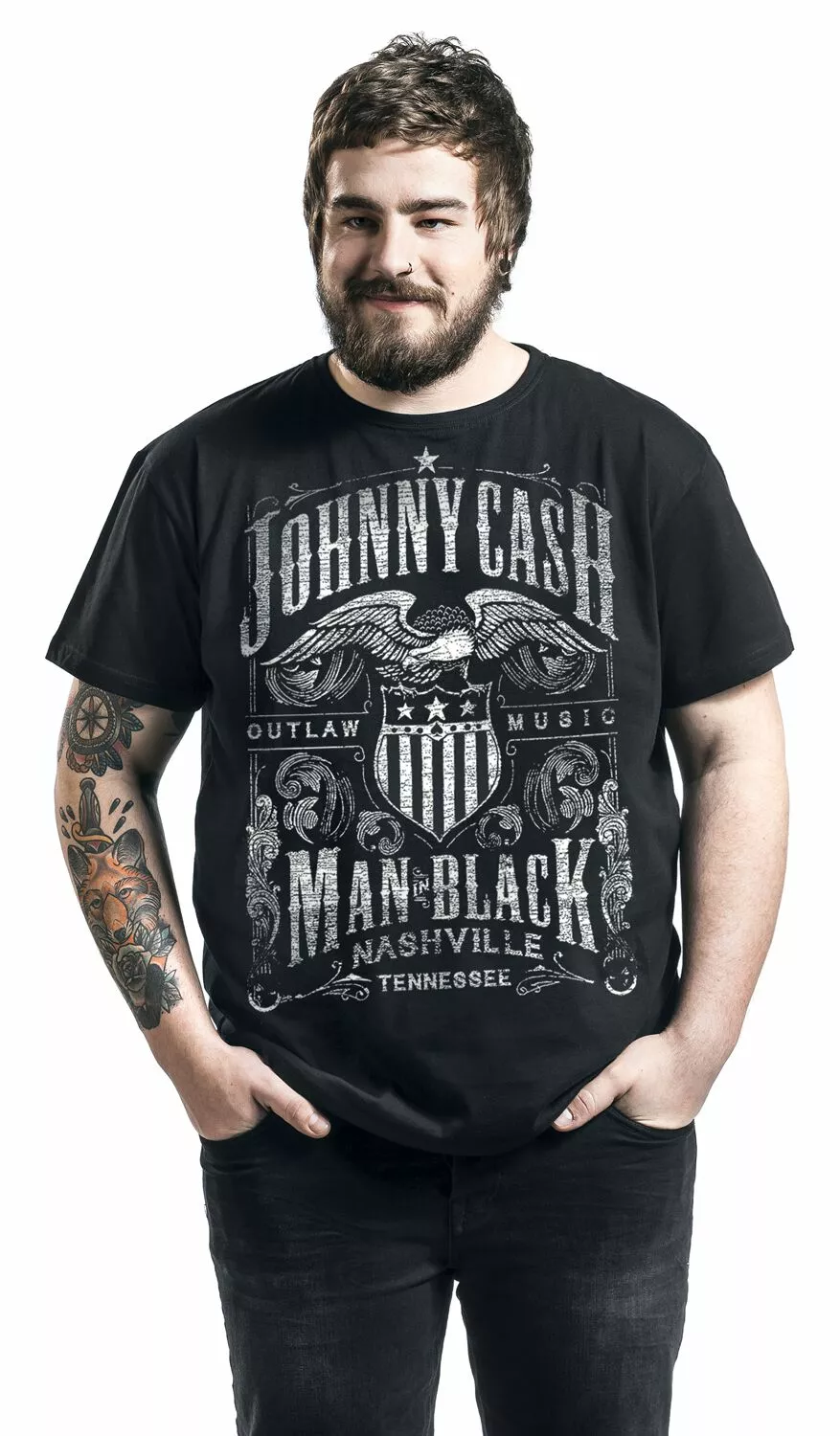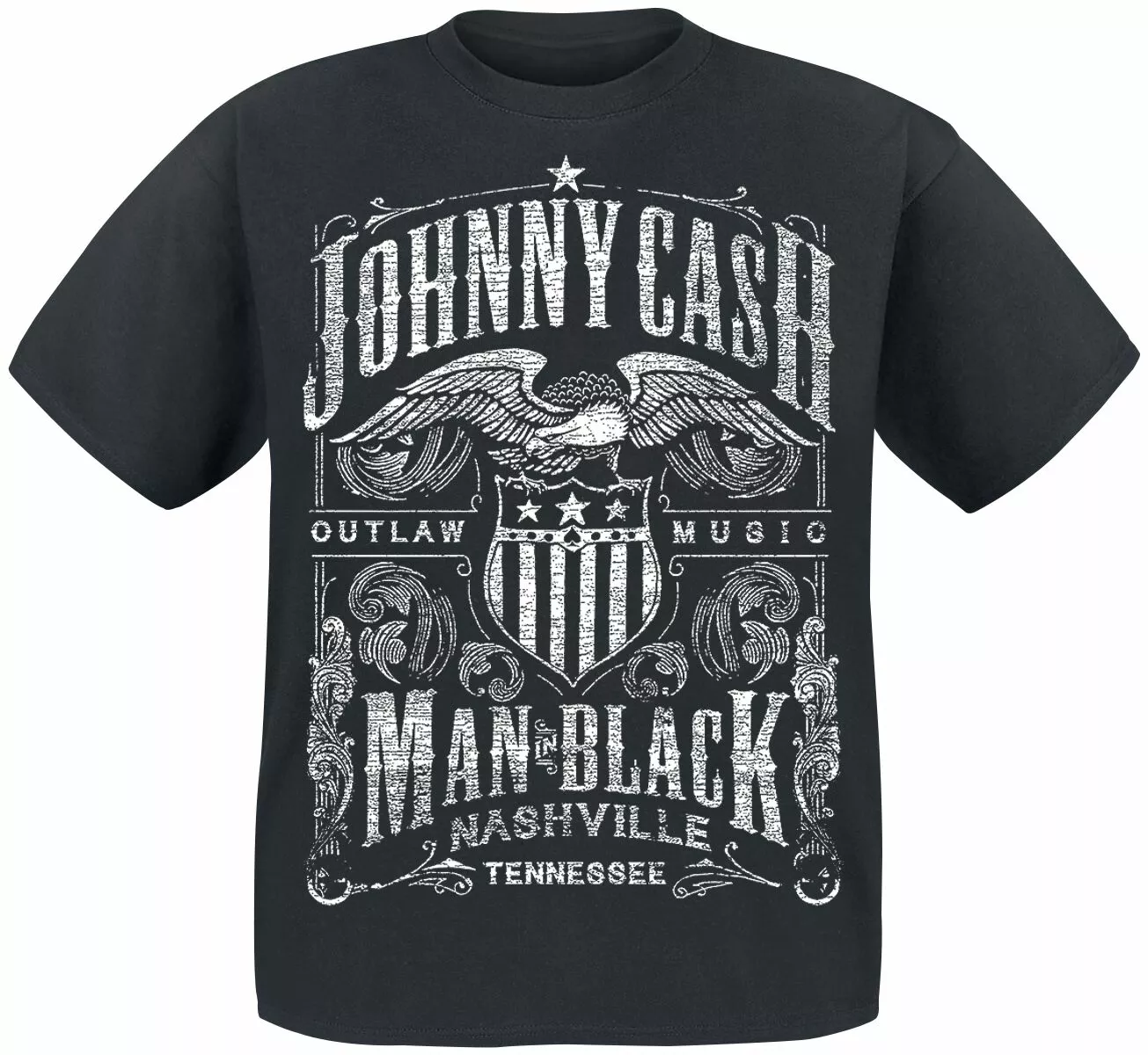 De legendarische Johnny Cash is één van de grootse en bekendste countryrockers aller tijden. Eer de muziekheld met het T-shirt “Outlaw Music”. Op de voorkant staat een grote, sierlijke print van Amerikaanse bodem met de tekst “Johnny Cash – Outlaw Music – Man in Black – Nashville Tennessee”. Het kledingstuk heeft korte mouwen, een ronde halslijn en een effen achterkant.