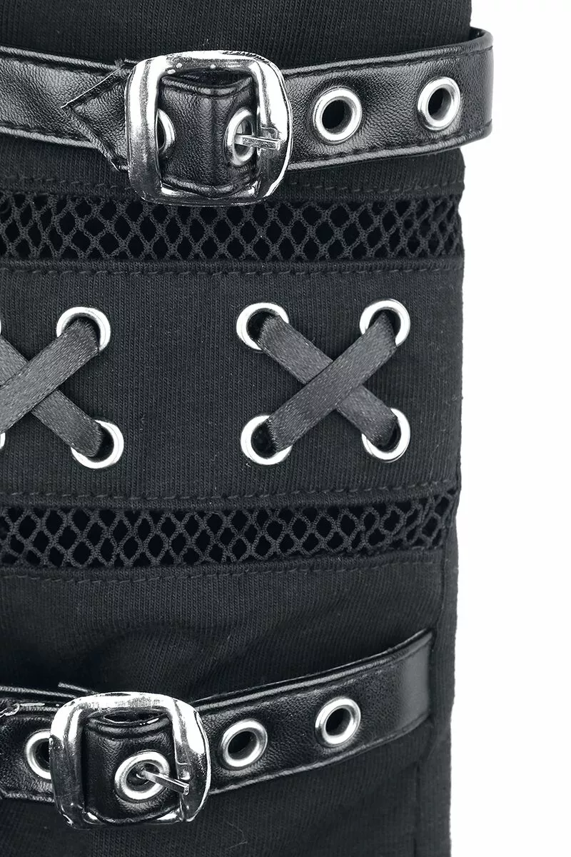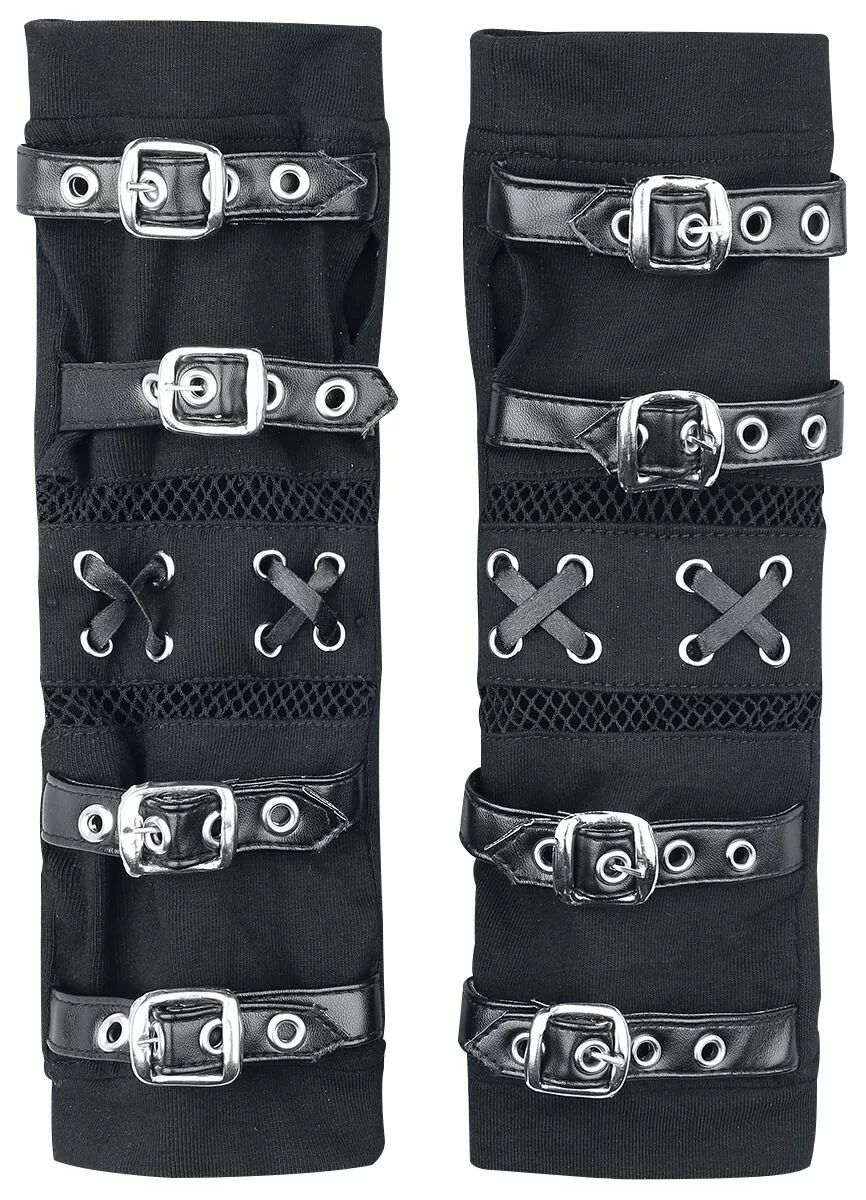 – zwarte armwarmers met decoratieve gespen, studs, veters, riemen en onderdelen van netstof