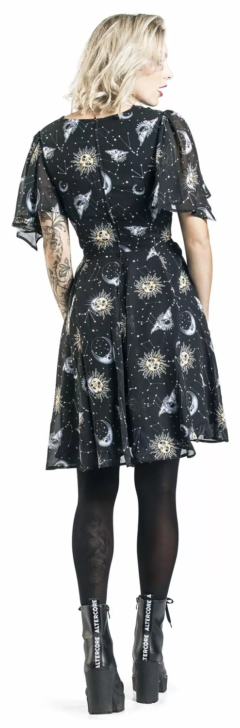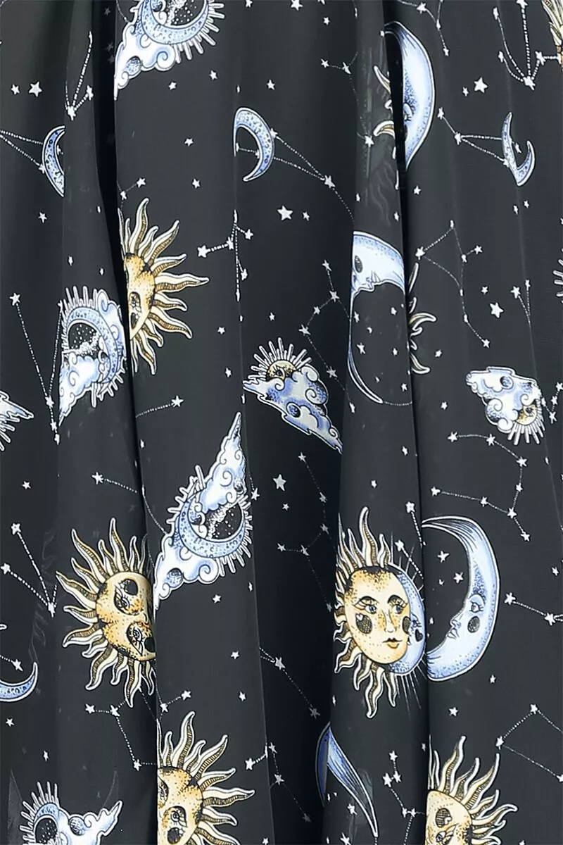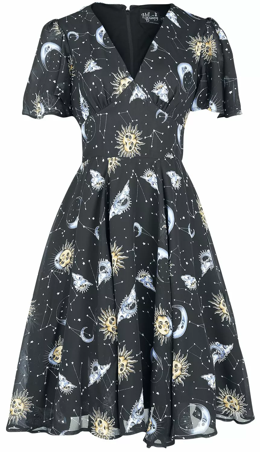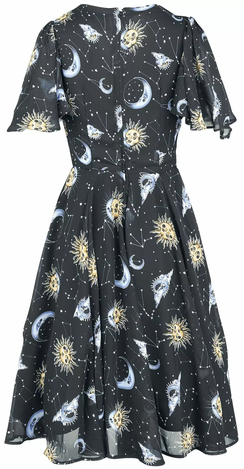 De “Solaris Dress” van Hell Bunny is prima geschikt voor allerlei soorten gelegenheden en trekt de aandacht met de bijzonder interessante all-over-print van manen en sterren. Daarbij heeft deze jurk korte mouwen, een stijlvolle V-hals en plooien onder de borst. Dankzij de ritssluiting in de achterkant is het kledingstuk gemakkelijk aan en uit te trekken.