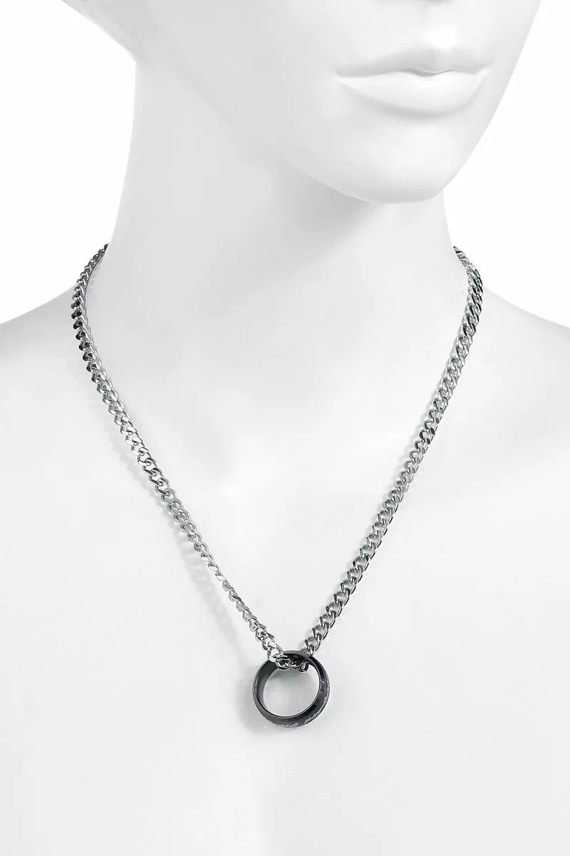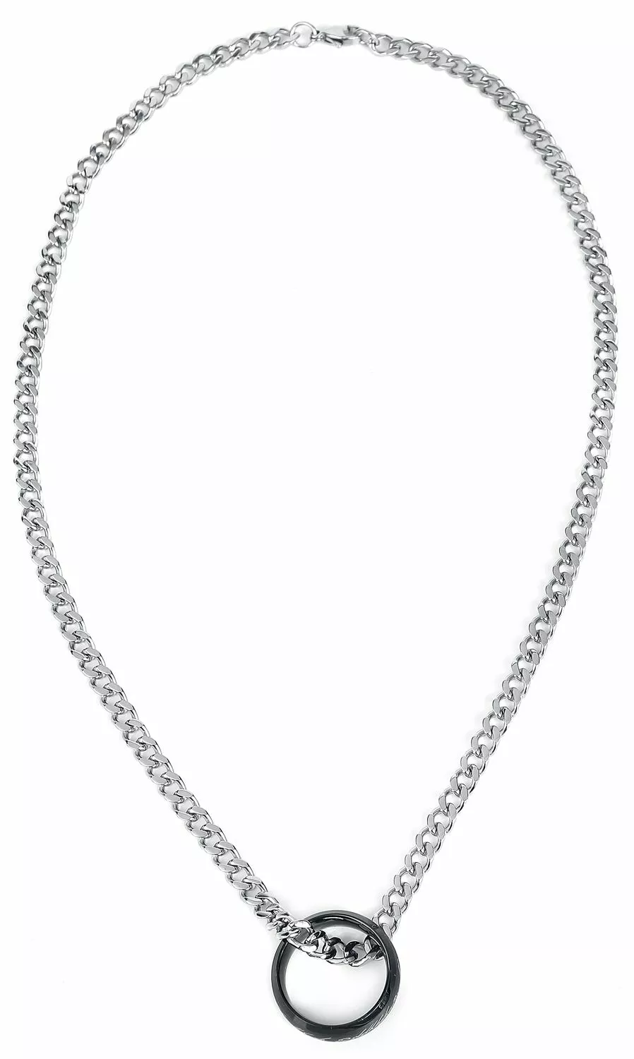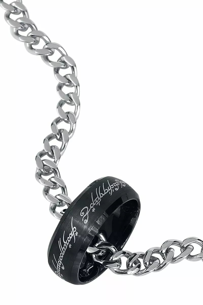 Ring van wolfraam met zwarte coating en lichte inscriptie. B: 8 mm. Incl. 50 cm lange roestvrij stalen ketting.