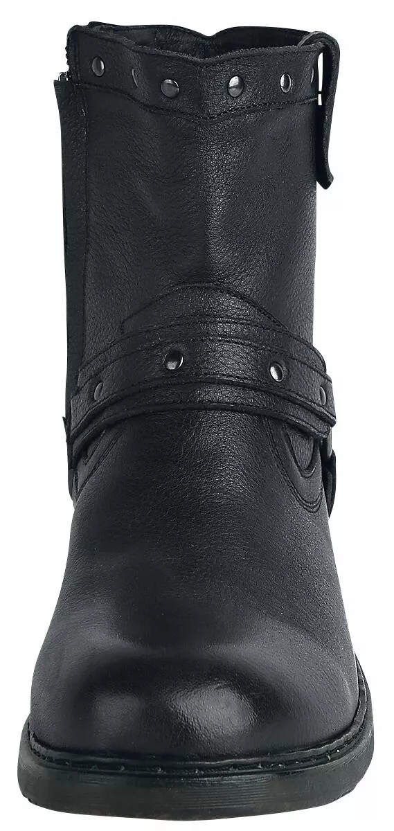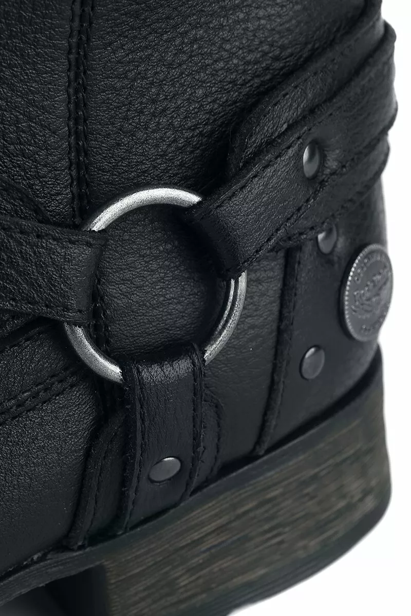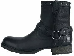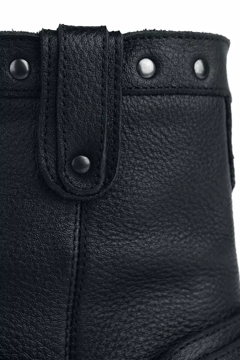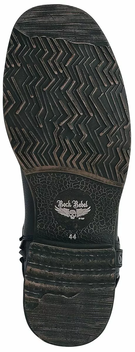 Op zoek naar een paar robuuste, stoere laarzen met een overtuigende bikerstijl? Dan ben je bij ons aan het juiste adres! Deze “Thunder Road”-laarzen van Rock Rebel by EMP zien er absoluut waanzinnig uit en hebben drie decoratieve banden met studs, die allen zijn bevestigd aan dezelfde ring. Ook de schacht is voorzien van decoratieve studs. De laarzen hebben verder een embleem met daarop het logo van Rock Rebel op de zijkant van de hiel en zijn gemakkelijk aan en uit te trekken dankzij de ritssluiting in de zijkant en de treklus aan de schacht.