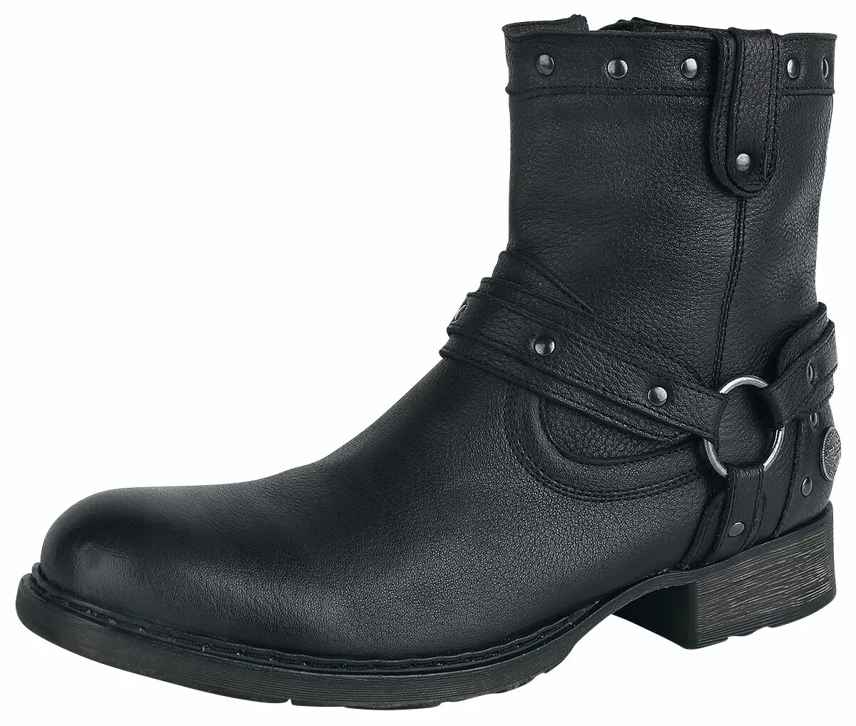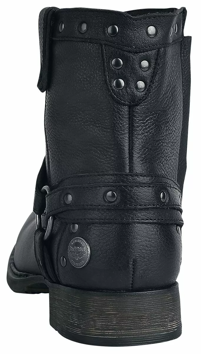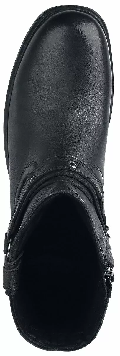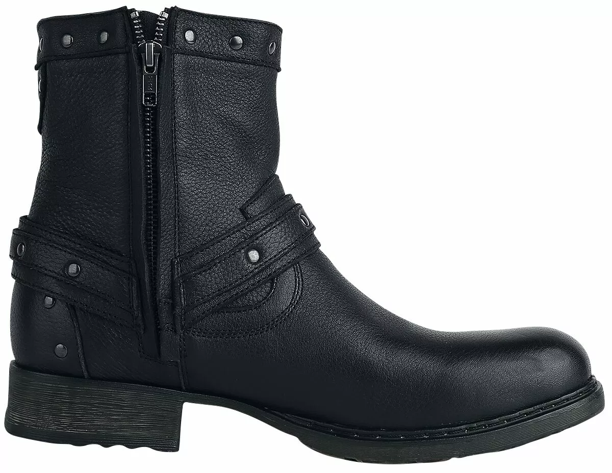 Op zoek naar een paar robuuste, stoere laarzen met een overtuigende bikerstijl? Dan ben je bij ons aan het juiste adres! Deze “Thunder Road”-laarzen van Rock Rebel by EMP zien er absoluut waanzinnig uit en hebben drie decoratieve banden met studs, die allen zijn bevestigd aan dezelfde ring. Ook de schacht is voorzien van decoratieve studs. De laarzen hebben verder een embleem met daarop het logo van Rock Rebel op de zijkant van de hiel en zijn gemakkelijk aan en uit te trekken dankzij de ritssluiting in de zijkant en de treklus aan de schacht.