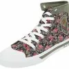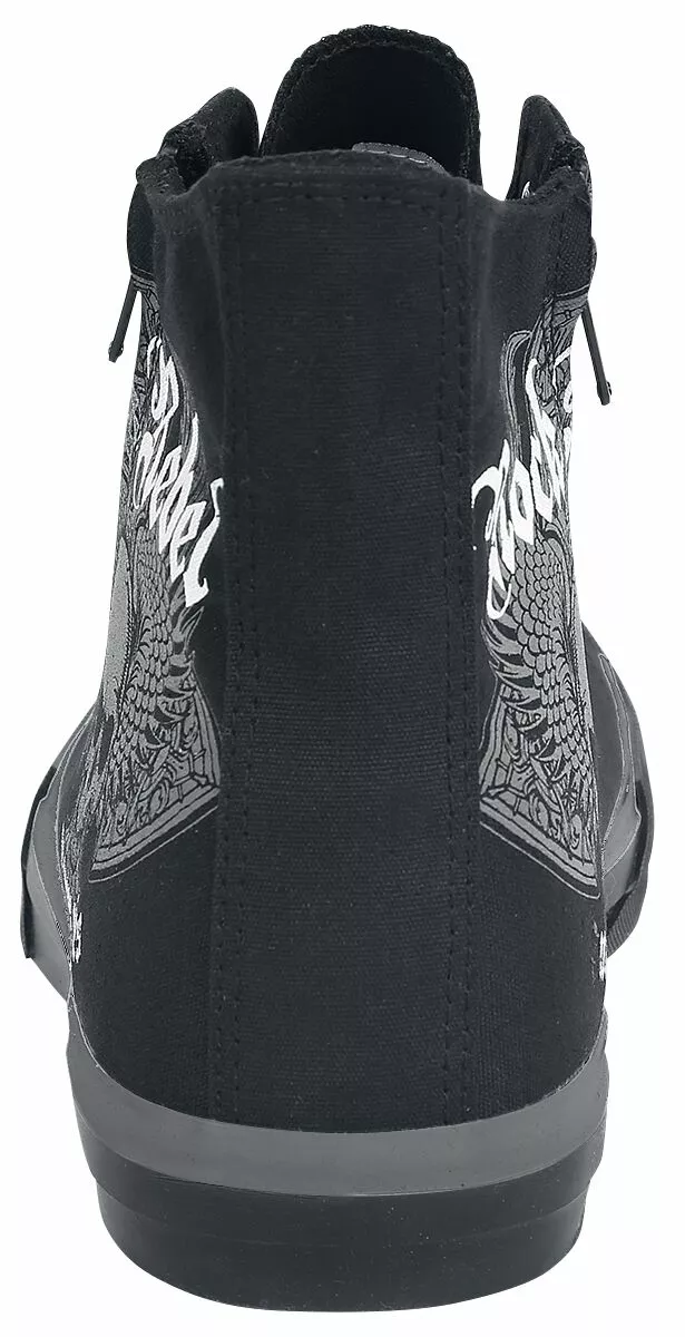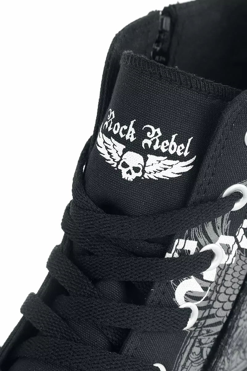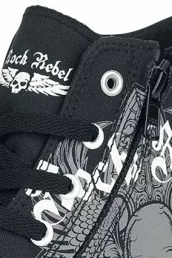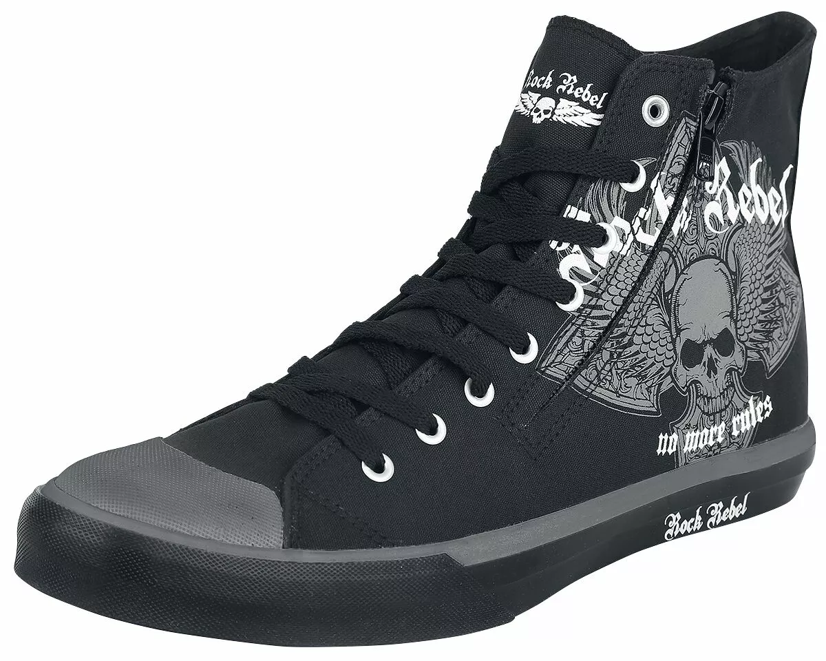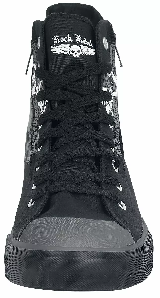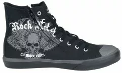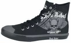 Met de sneakers “Walk the Line” van Rock Rebel by EMP, geef je jezelf een rebels uiterlijk! Deze stijlvolle schoenen zijn gemakkelijk aan en uit te trekken dankzij de schoenveters en de ritssluiting in de zijkant. De print met gevleugelde schedel op de zijkant van de sneakers en de print van Rock Rebel op de schoentong en op de zool maken het rebelse uiterlijk van de schoenen helemaal compleet.